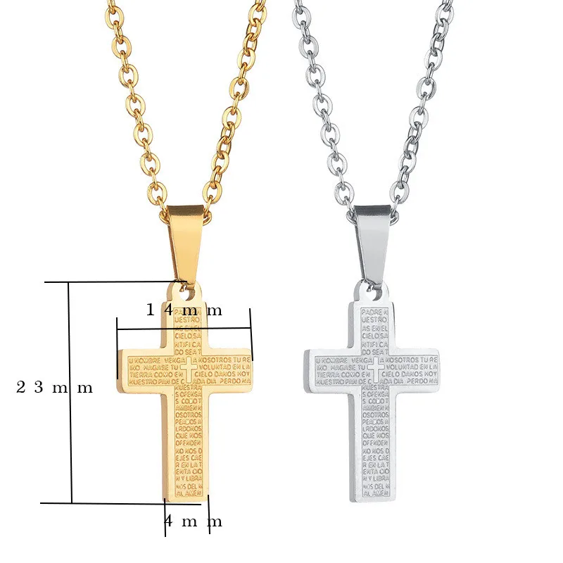 1. Тип товара: ожерелья для верующих (с изображением Иисуса) 2. Материал: нержавеющая сталь 3. Цвет: серебристый, золотой 4. Размер: длина цепочки: 50 см Кулон: 2,3*1,4 см (1 см = 0.394in) 5. Стиль: Религия 6. Форма: крест 7. Рисунок: Писание