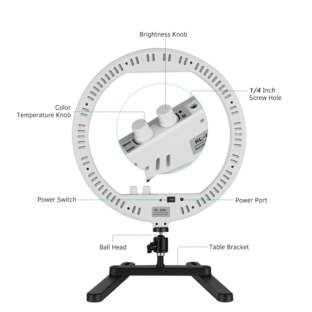 【 13 дюймовый кольцевой светильник и специальный Настольный кронштейн 】:Светильник в форме кольца может создать эффект диафрагмы круга, который сделает ваши глаза более привлекательными, без мерцания, защитит ваши глаза. Поставляется с Портативная шариковая головка для регулировки угла наклона, вы можете установить светодиодный кольцевой светильник на столе кронштейн или светильник ing стенд и регулировать светильник в самом лучшем светильник в направлении.