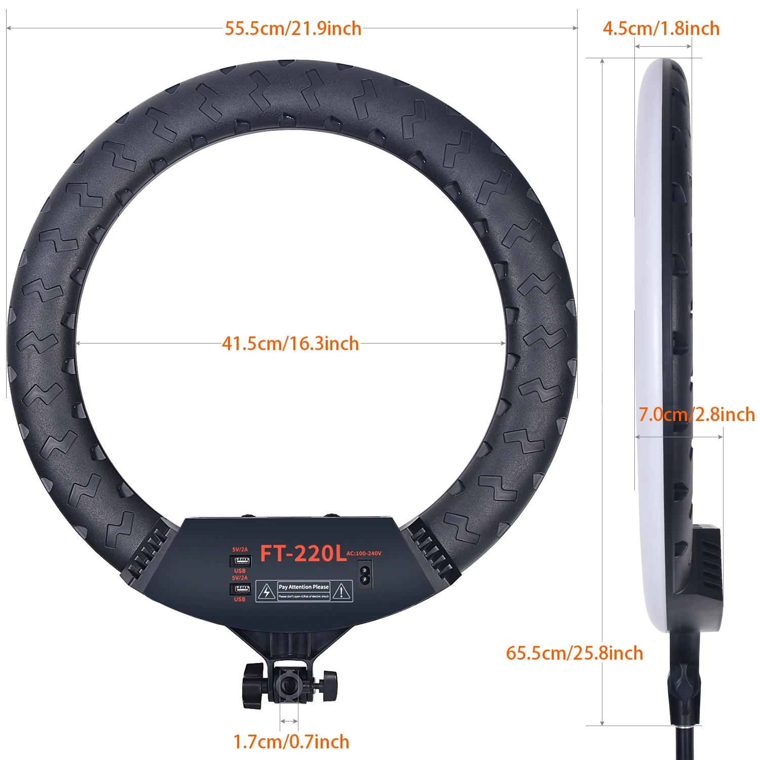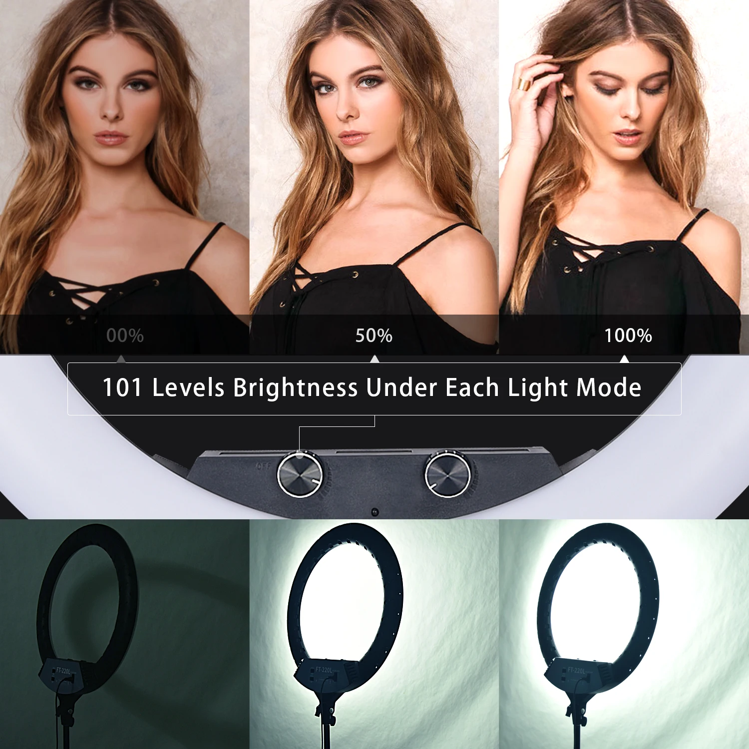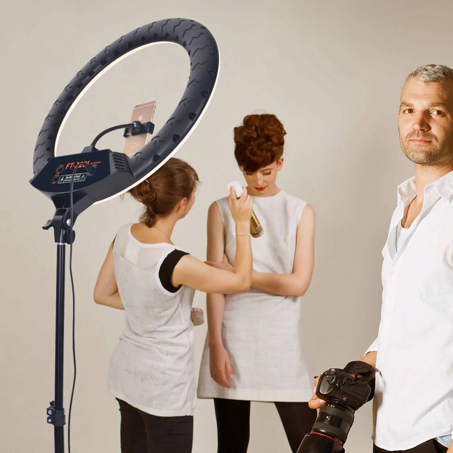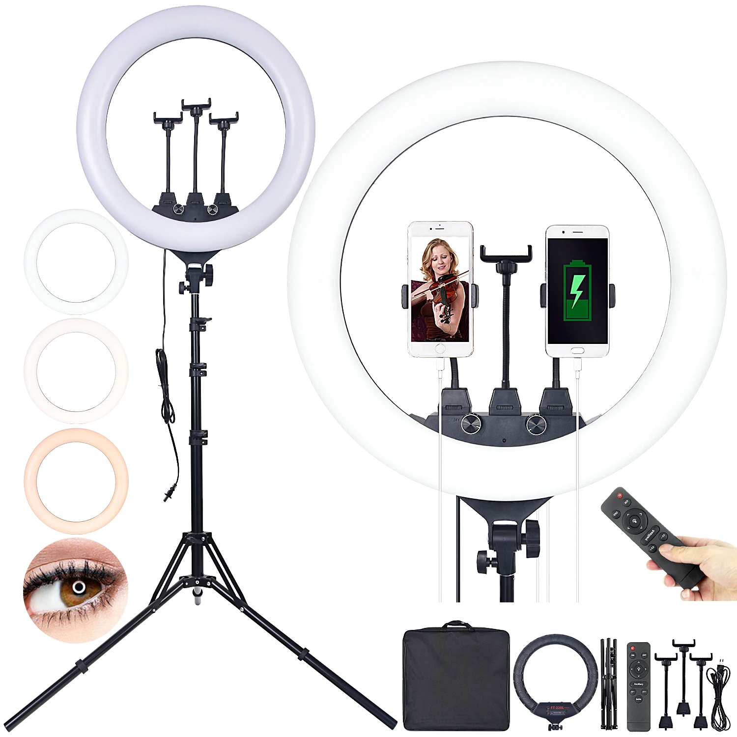 22-дюймовый (FT-220L) и 18 дюймов (FT-180L) Bi-Цветовая температура заполняющий свет с высоким индексом цветопередачи и мощности. Что делает его особенным, так это то, что он может использовать три держателя телефона одновременно. Вы можете сделать прямую трансляцию на другой платформе одновременно. Более того, он имеет два usb-порта, которые могут заряжать ваш мобильный телефон. Кроме того, лампу можно управлять с помощью пульта дистанционного управления. Это очень удобно для использования при вещании. Этот заполняющий свет широко используется в комнатной и наружной съемке, макияже, прямой трансляции, татуировке и т. Д. Гарантированное качество.