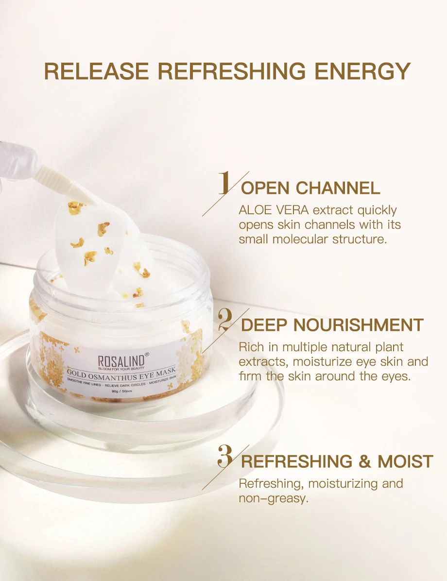 Бренд: ROSALIND Название: Золото османтуса маска для глаз Характеристики: 90 г/50 шт. Характеристики продукта: глубоко увлажняет, успокаивает кожу глаз, устраняет мешки для глаз и удаляет линии глаз. Срок годности: 3 года Происхождение: Китай