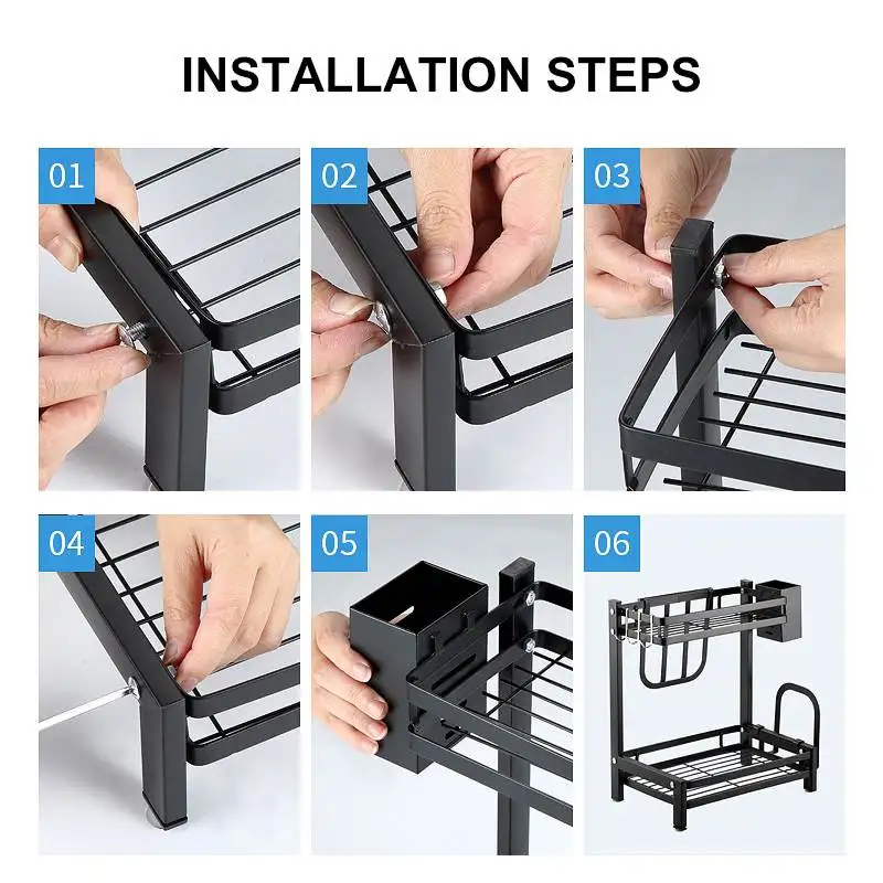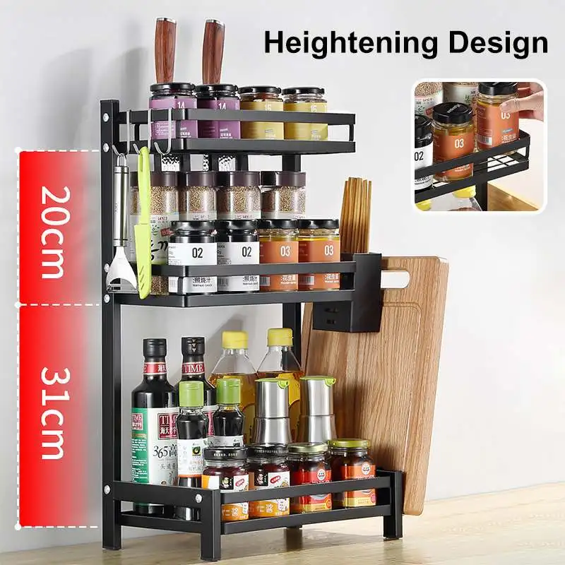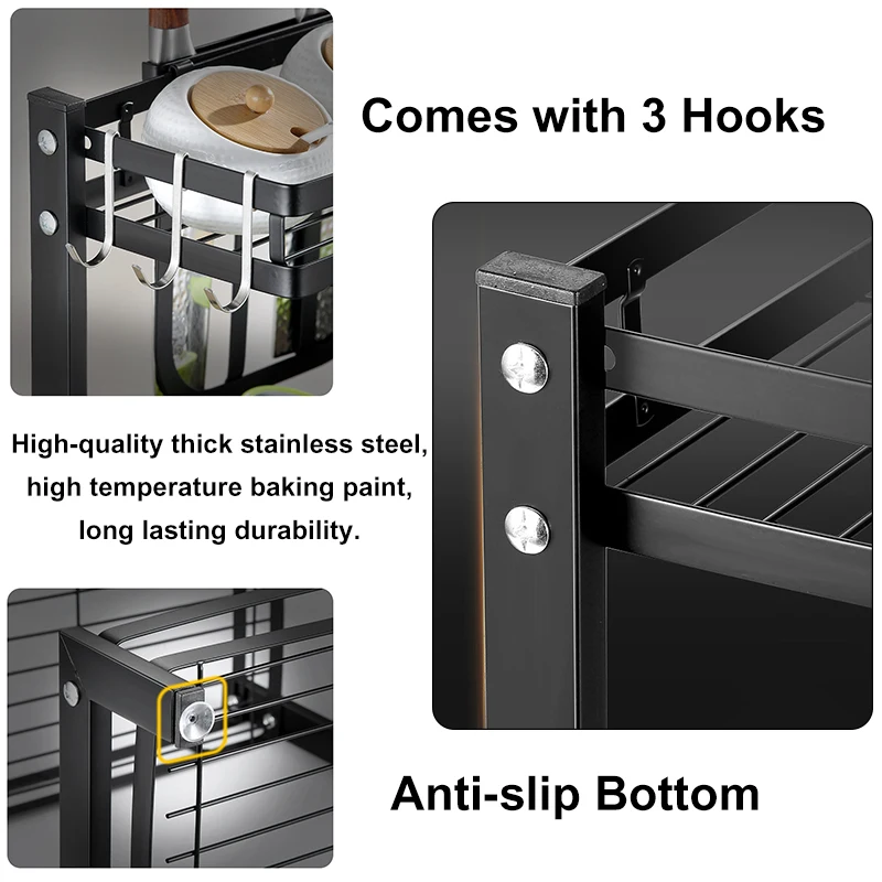 * MULTI-PURPOSE: This 3 tier metal spice rack come with Knives holder/Utensil holder/Chopping board holder and 3 hooks is actually very versatile and even could be used in bathroom/beauty/hair products/craft room/office.