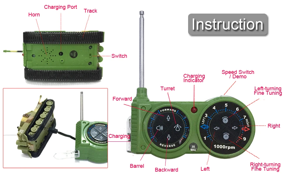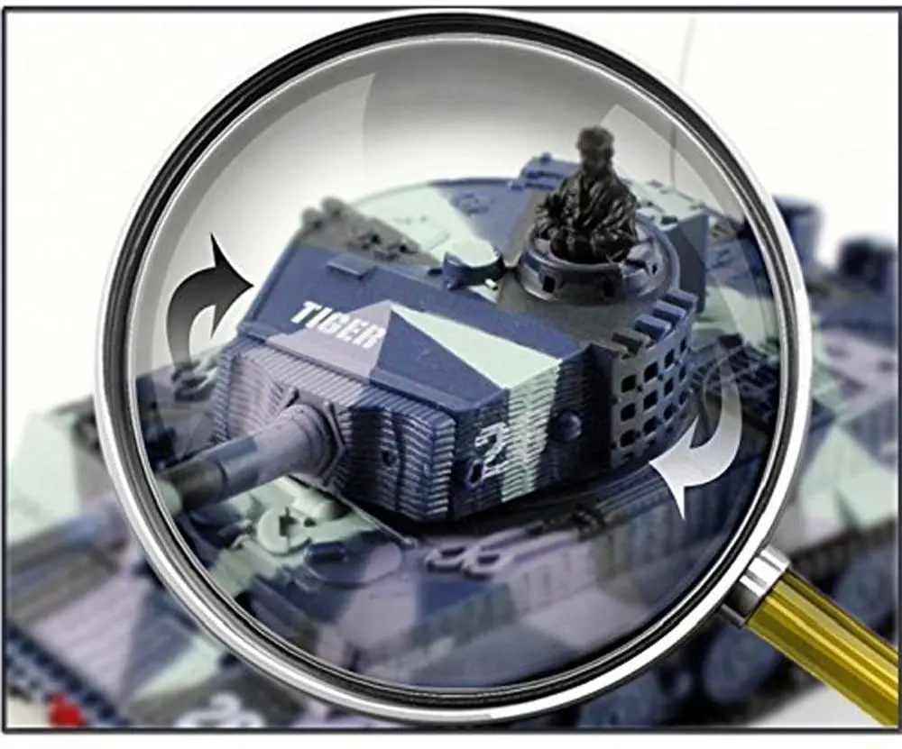 Функция: вперед, поворот налево, поворот направо, назад со светом Пульт имеет четыре различных канала для 4 различных игроков Гибкие и рабочие пластиковые гусеницы Ствол пистолета двигается вверх и вниз Переключатель высокой/низкой скорости Реалистичный двигатель, ход башенки, звуковые эффекты стрельбы