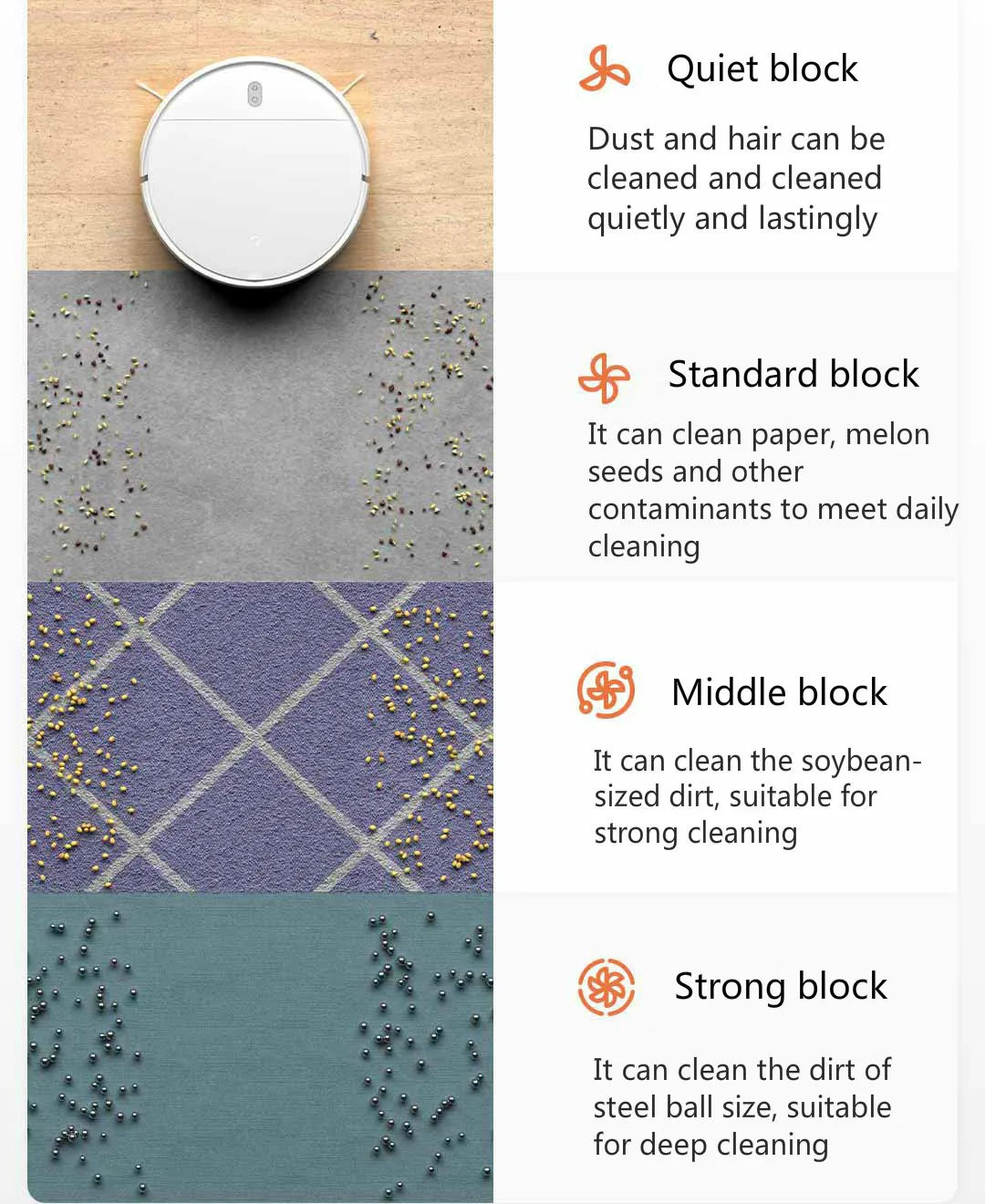 В соответствии с различными комнатами, различные грязи установить четыре всасывания. Большой стальной шарик, соевые бобы, маленькие, чтобы вздремнуть, волосы могут легко