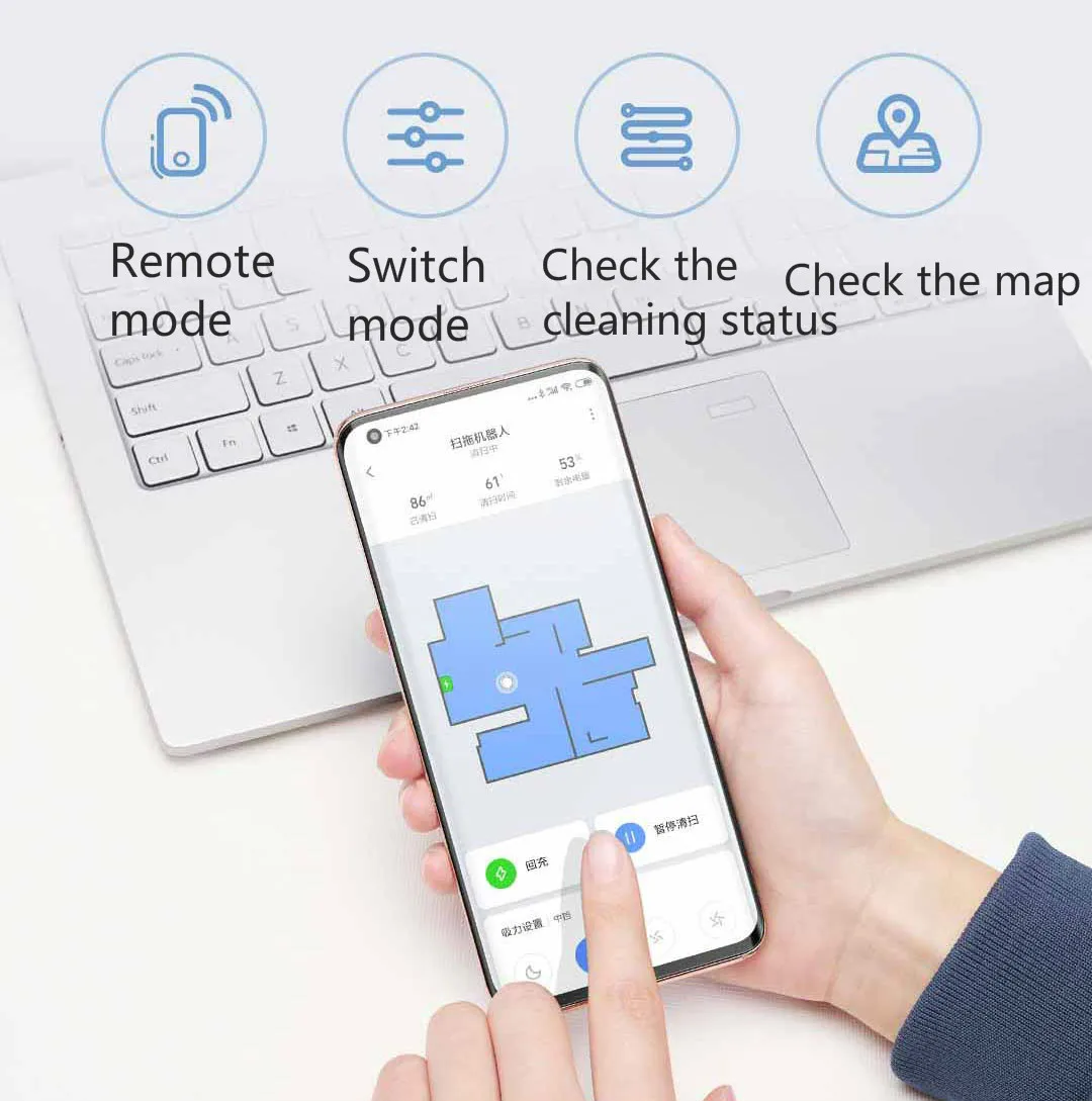 Вы можете легко очистить, когда вас нет дома. Просто откройте приложение Mijia и начните удаленно одним щелчком мыши. Переключение режимов, Просмотр статуса очистки в режиме реального времени и полное управление в любое время и в любом месте.