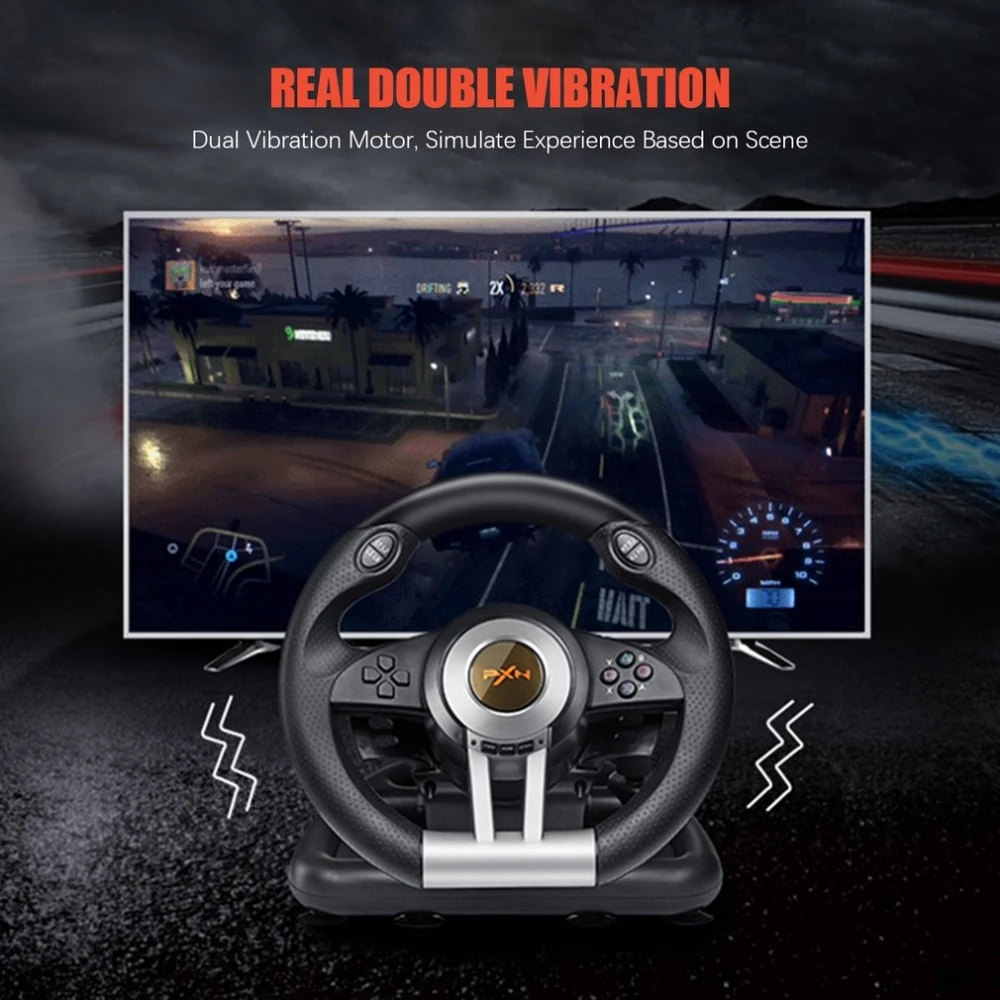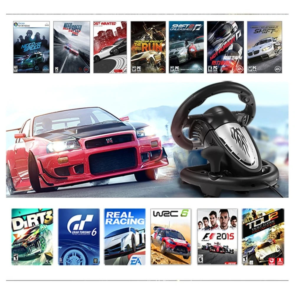 Совместимость с ПК, PS3, PS4 и Xbox One, удовлетворит ваши различные требования к играмС 7 мощными присосками и U-образным кронштейном, удобно фиксировать и игратьРулевое колесо на 180 градусов, простое управлениеВы можете нажать на педали, чтобы управлять акселератором и тормозом