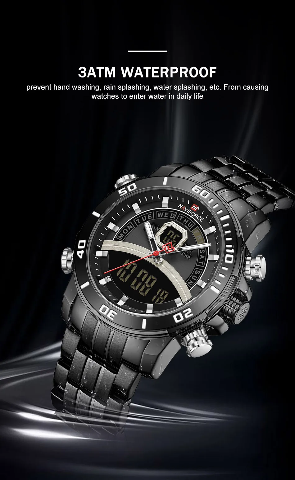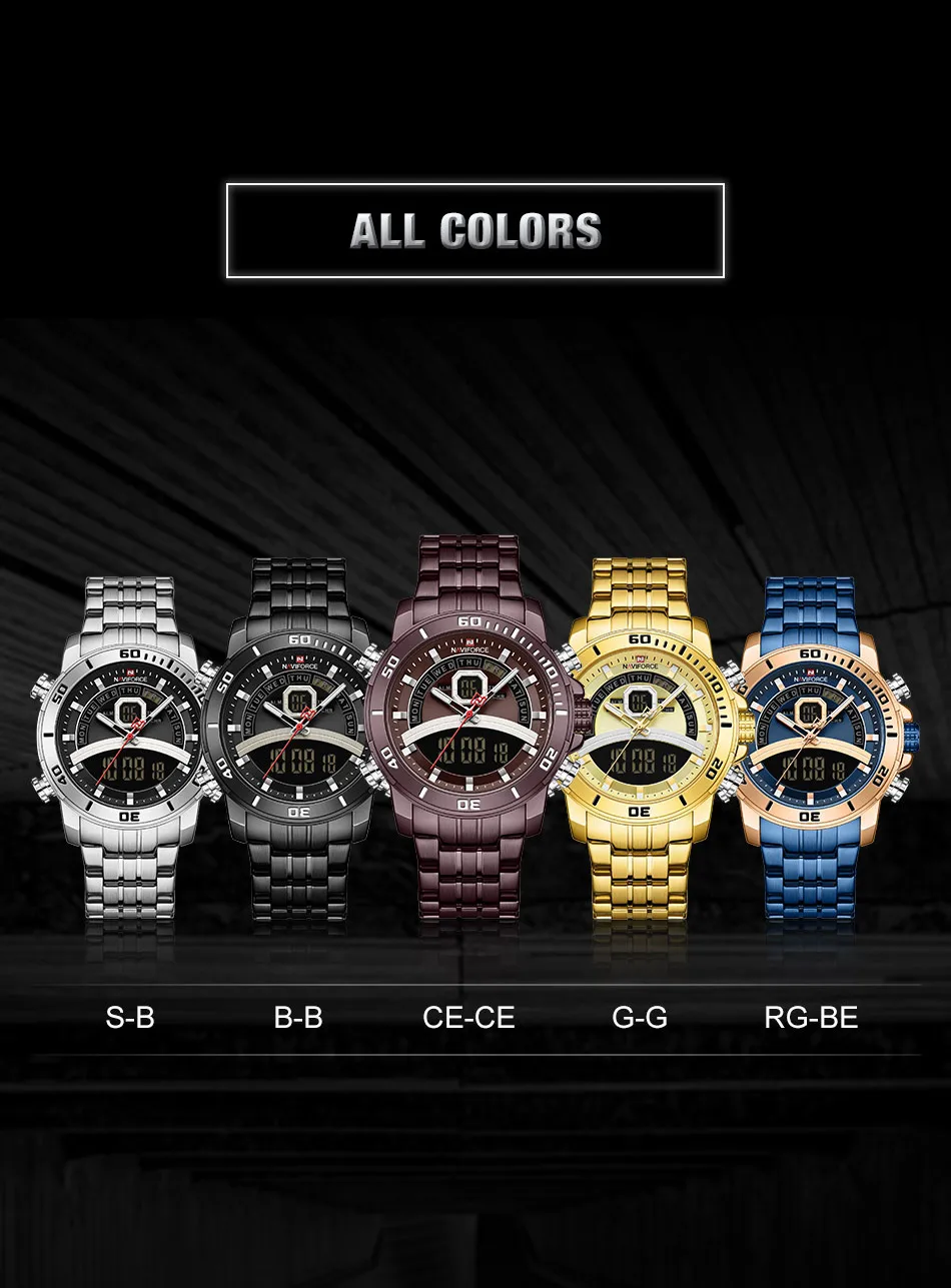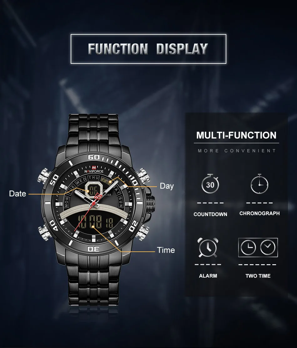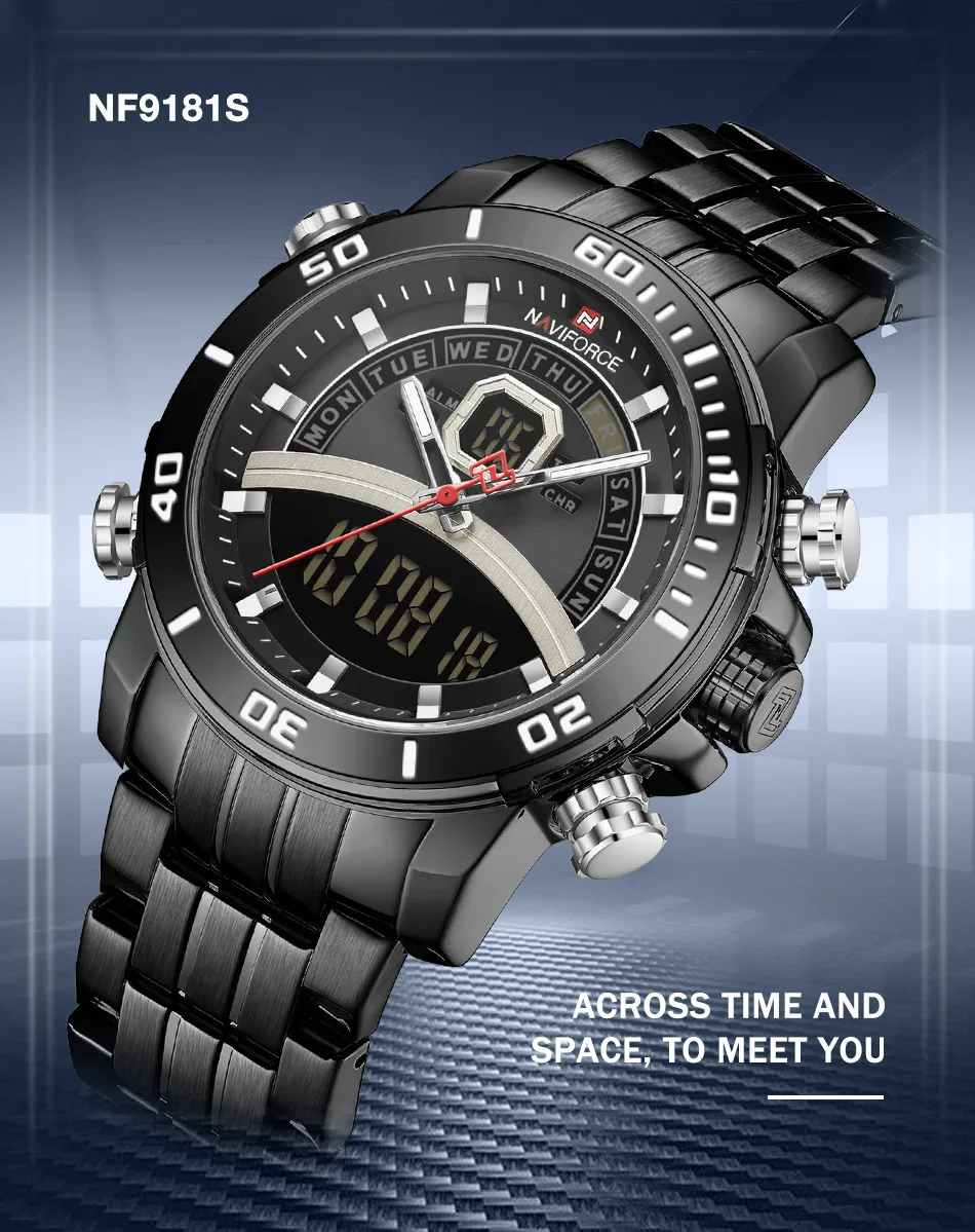 Описание продукта: 100% оригинал новый и высокое качество Будильник с 4 мин, Повтор Отображение дня, даты и времени Рождество каждый час Хронограф с круговым механизмом и 1/100 Двойное Ядро движения Аналоговый и цифровой светодиодный дисплей Функция EL (синий) Ежечасная Мелодия курантов, Функция Нержавеющая сталь ремень 30 м водонагреватель Кожаный ремешок Технические характеристики Материал корпуса: сплав Чехол Диаметр: 45 мм Чехол Толщина: 15,5 мм Материал ремешка: ремешок из натуральной кожи Группа Длина в праздничные дни (включая чехол): 260 мм Ширина ремешка: 24 мм Вес изделия: 100 г Сталь ремешок Технические характеристики Материал корпуса: сплав Чехол Диаметр: 45 мм Чехол Толщина: 15,5 мм Материал ремешка: ремешок из нержавеющей стали Длина ремешка (включая чехол): 240 мм Ширина ремешка: 24 мм Продукт Вес: 182 г Что входит в комплект 100% новый бренд NAVIFORCE 1 x аналоговый и цифровой дисплей с будильником и EL Blue Function Watch