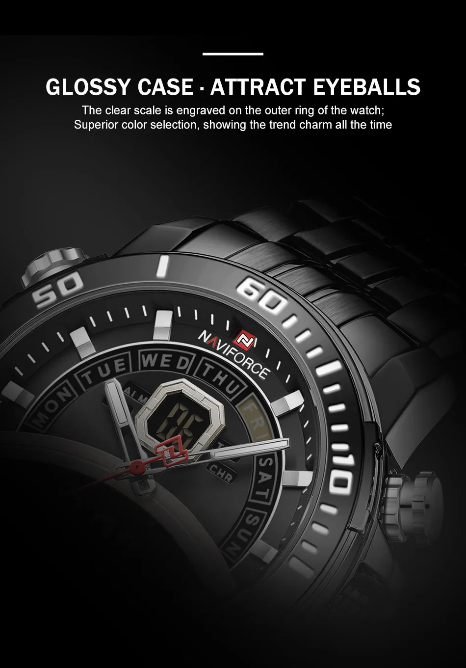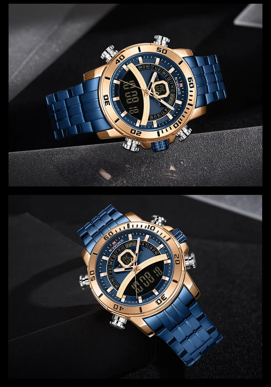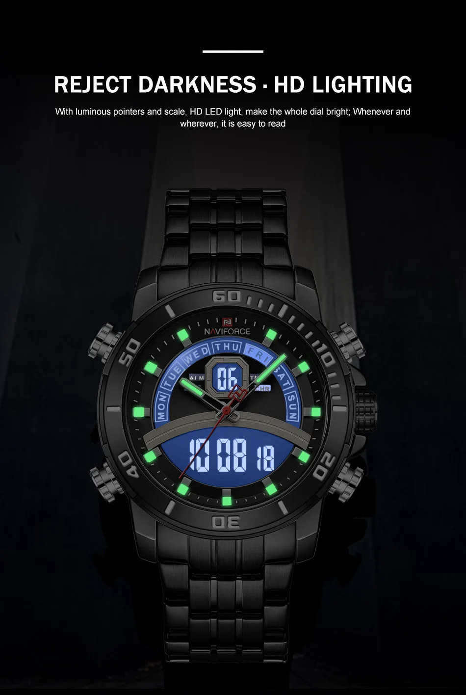 Описание продукта: 100% оригинал новый и высокое качество Будильник с 4 мин, Повтор Отображение дня, даты и времени Рождество каждый час Хронограф с круговым механизмом и 1/100 Двойное Ядро движения Аналоговый и цифровой светодиодный дисплей Функция EL (синий) Ежечасная Мелодия курантов, Функция Нержавеющая сталь ремень 30 м водонагреватель Кожаный ремешок Технические характеристики Материал корпуса: сплав Чехол Диаметр: 45 мм Чехол Толщина: 15,5 мм Материал ремешка: ремешок из натуральной кожи Группа Длина в праздничные дни (включая чехол): 260 мм Ширина ремешка: 24 мм Вес изделия: 100 г Сталь ремешок Технические характеристики Материал корпуса: сплав Чехол Диаметр: 45 мм Чехол Толщина: 15,5 мм Материал ремешка: ремешок из нержавеющей стали Длина ремешка (включая чехол): 240 мм Ширина ремешка: 24 мм Продукт Вес: 182 г Что входит в комплект 100% новый бренд NAVIFORCE 1 x аналоговый и цифровой дисплей с будильником и EL Blue Function Watch