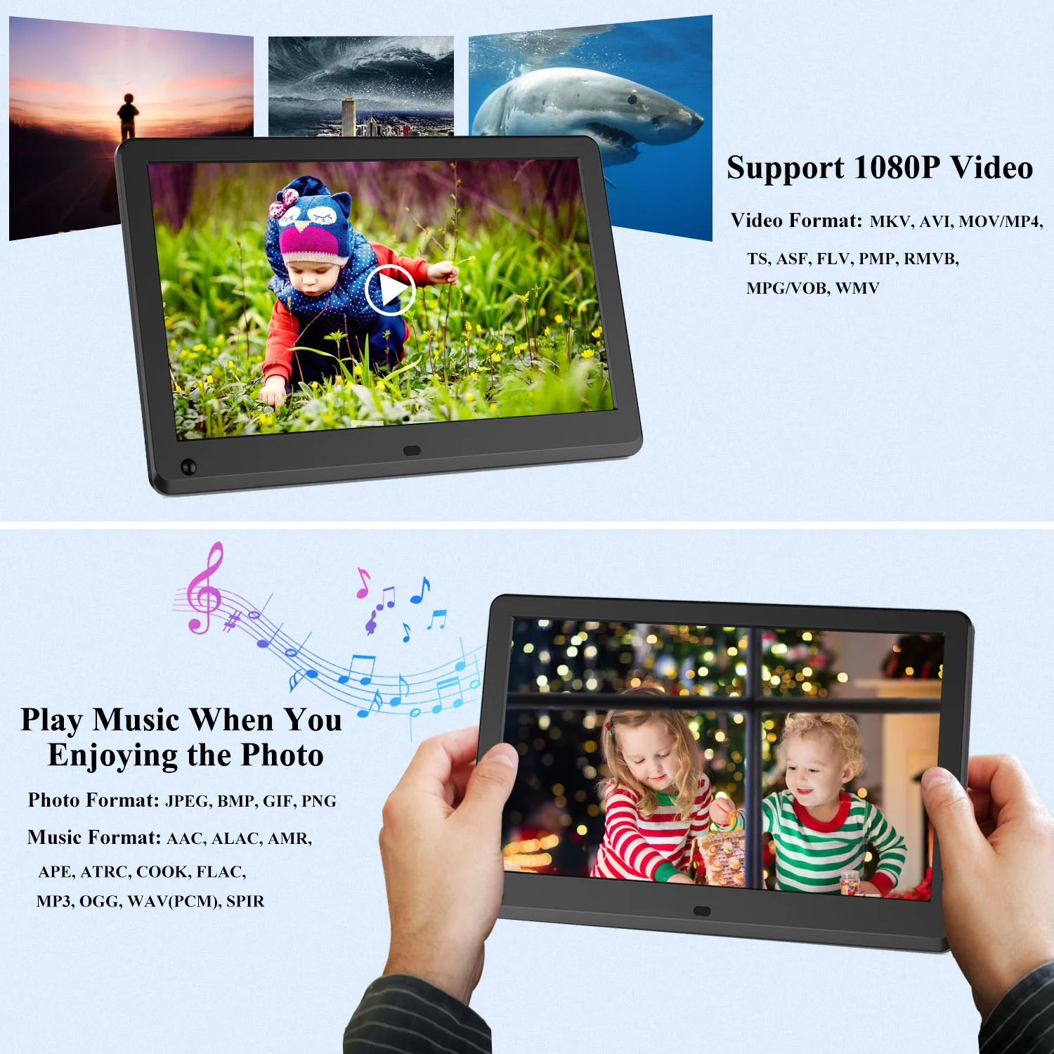 Особенности: 12-дюймовая цифровая фоторамка с высоким разрешением 1920*1080 ЖК-дисплей дисплей. Отображение ваших любимых фотографий в автоматическом режиме слайд-шоу. Богатые и яркие цвета показывают ваши фотографии с замечательным качеством изображения. Воспроизведение видео и музыки со встроенными динамиками и выходным разъемом для наушников. Часы, календарь, будильник и настройка времени. Встроенный Стереодинамик, чтобы наслаждаться любимой музыкой. Без требуемой установки и программного обеспечения для установки. С двумя usb-соединениями: один для чтения флэш-диска U; Один для подключения к компьютеру. Вы даже можете взять sd-карту с камеры и воспроизводить фотографии напрямую без дополнительной обработки. В комплект входит подставка для поддержки настольных компьютеров. Компактный ИК-пульт дистанционного управления для удобного доступа к элементам управления воспроизведением. Может использоваться как MP3/MP4/Электронная книга/Календарь или часы. Это станет отличным центром для любого дома, офиса или бизнеса. Параметры: Материал: Пластик Размер экрана: 12 дюймов Цвет: черный, белый Вилка: ЕС, США, Великобритания Разрешение: 1920*1080 ЖК-дисплей Метод управления: чешский, немецкий, английский, испанский, французский, итальянский, венгерский, Голландский, Португальский, упрощенный китайский Совместимость с: защищенная цифровая карта памяти (SD), мультимедийная карта (MMC), карта памяти (MS) Считывает карту памяти: макс. до 32 г Формат изображения: JPEG,BMP,GIF,PNG Формат музыки: MP3,WMA,OGG,FLAC,APE,AAC,AC3,ATRA,DTS Формат видео: MKV,AVI,MOV,MP4,TS,ASF,FLV,PMP,RMVB,MPG,VOB,WMV Вход адаптера: AC 110 ~ 240 В Адаптер Выход: 5V 2000mA Источник питания: адаптер переменного тока 110 ~ 240 В Аккумулятор контроллера: 1 * CR2032 Посылка список: 1 * цифровая фоторамка 1 * подставка для рамки 1 * пульт дистанционного управления 1 * Адаптер питания переменного тока 1 * Руководство пользователя (на английском языке)
