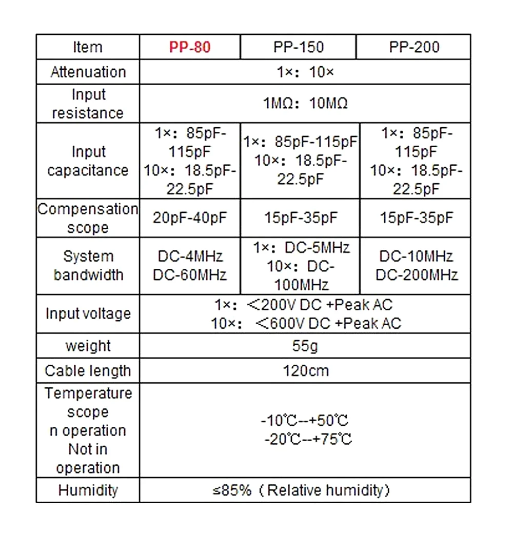 Цвет: черный + серый Тип: PP-80 / PP-150/PP-200/PP-250 Затухание: x1 x10 Входное сопротивление: 1MΩ: 10MΩ Входная емкость: x1: 85pF-115pF X10: 18.5pF-22.5pF Диапазон компенсации: 15pF ~ 35pF Полоса пропускания системы: x1: DC-5MHz X10: DC-100MHz Входное напряжение: x1: <200 В постоянного тока + Пик переменного тока X10: <600 В постоянного тока + Пик переменного тока Рабочая температура: -10 градусов ~ + 50 градусов/14 градусов по Фаренгейту ~ 122 градусов по Фаренгейту Нерабочая температура:-20 градусов ~ + 75 градусов/ -4 Фаренгейта ~ 167 Фаренгейта Влажность: ≤ 85% (относительная влажность) Длина кабеля: 120 см Размер изделия: прибл. 17*2*2 см/6,7*0,8 * 0.8in (только зонд) Вес изделия: прибл. 49,1g/1,7 oz