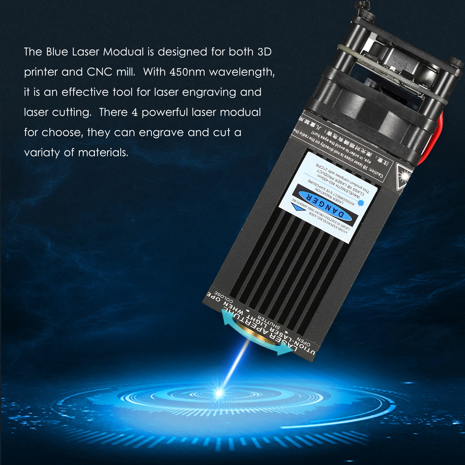 The Blue Laser Modual is designed for both 3D printer and CNC mill. With 450nm wavelength, it is an effective tool for laser engraving and laser cutting. There 4 powerful laser modual for choose, they can engrave and cut a variaty of materials.