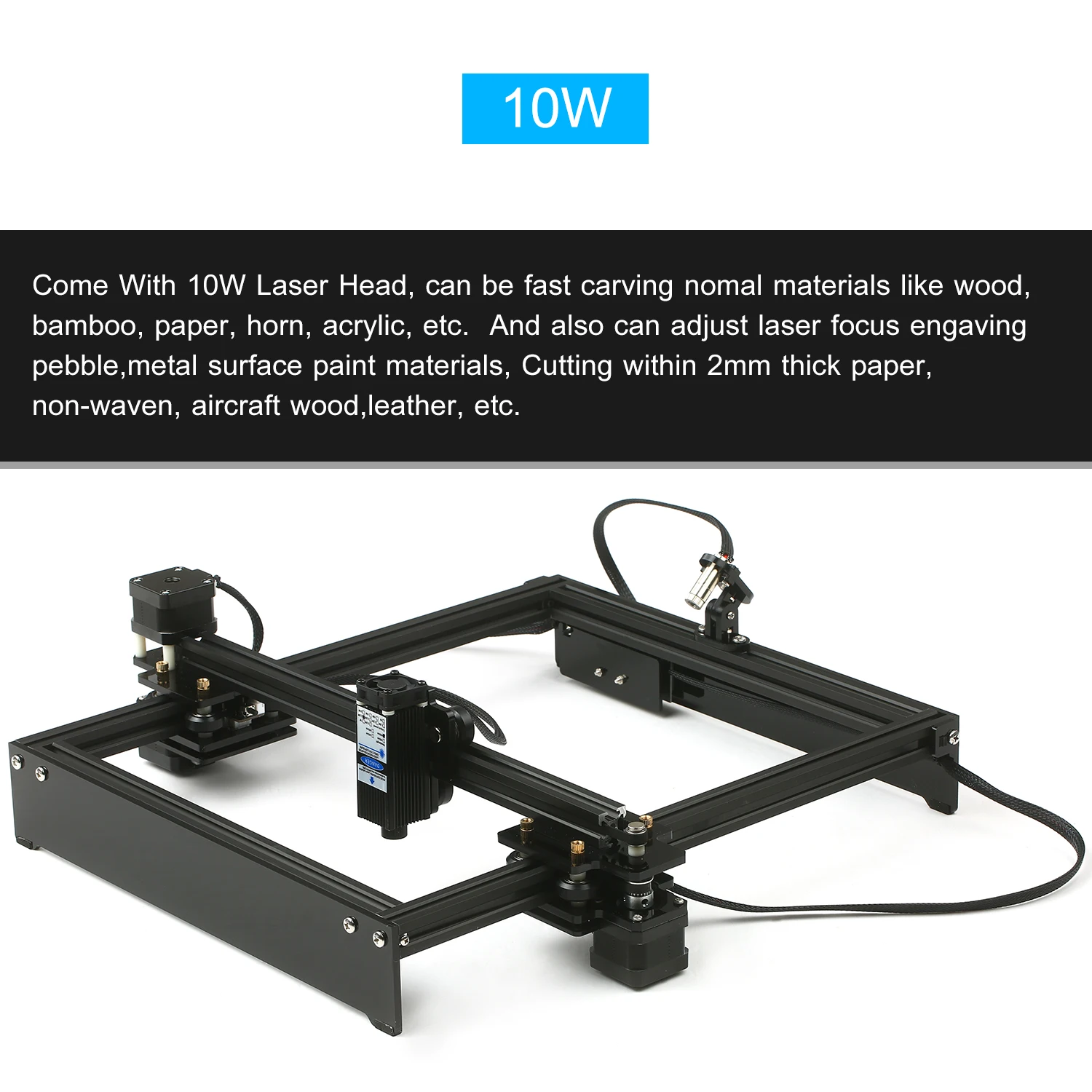 5500mW Laser Engraving and Cutting Materia --- Engraving Wood type, some plastics, paper, bamboo, horn, thin leather (wallet), rubber stamp, tooth, PU, Printing paper, PVC, horn, crab shell, lobster, mammoth, ivory, linden root, resin, spectacle lens, metal painted surface,those kinds of flammable materials. cutting Within 1.5mm thick paper, leather, non-woven fabrics, flocking fabrics, aircraft wood, stickers, etc.