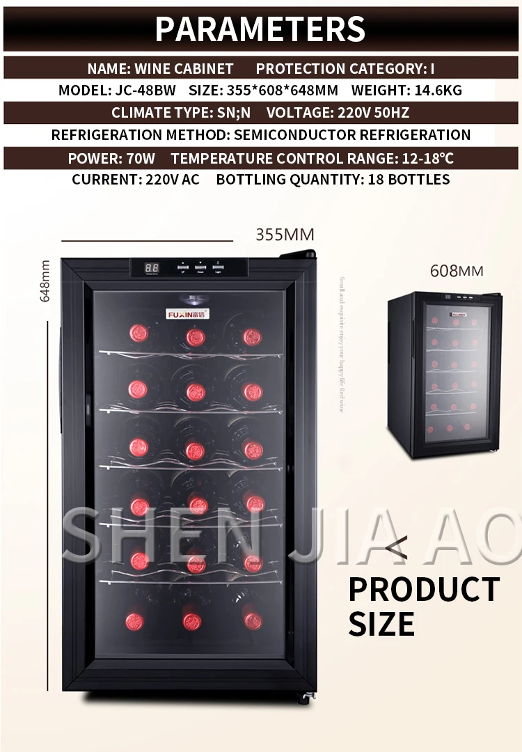 Название: винный шкаф Категория защиты: I Модель: JC-48BW Размер: 355*608*648 мм Вес: 14,6 кг Тип климата: SN; N Напряжение: 220 В 50 Гц Метод охлаждения: полупроводниковое охлаждение Мощность: 70 Вт Диапазон контроля температуры: 12-18 ℃ Ток: 220 В переменного тока Количество розлива: 18 бутылок