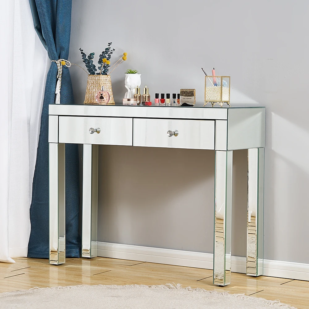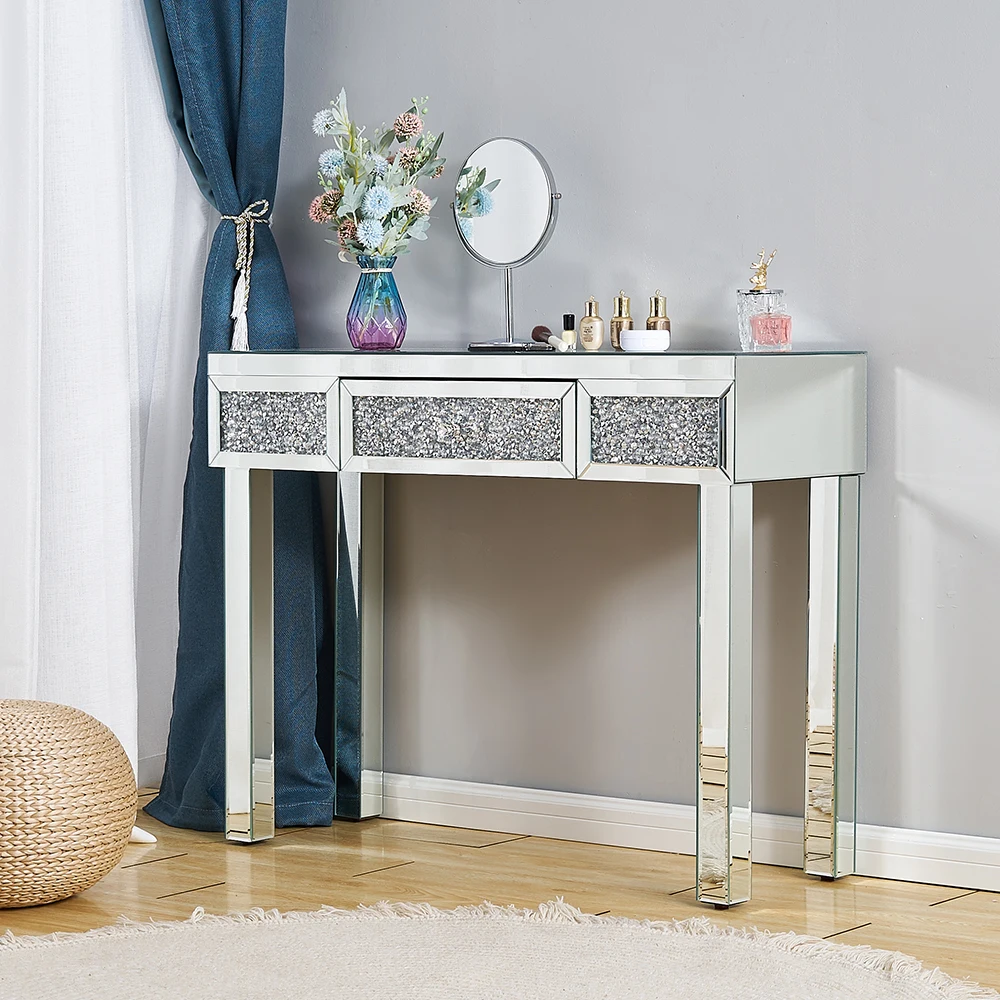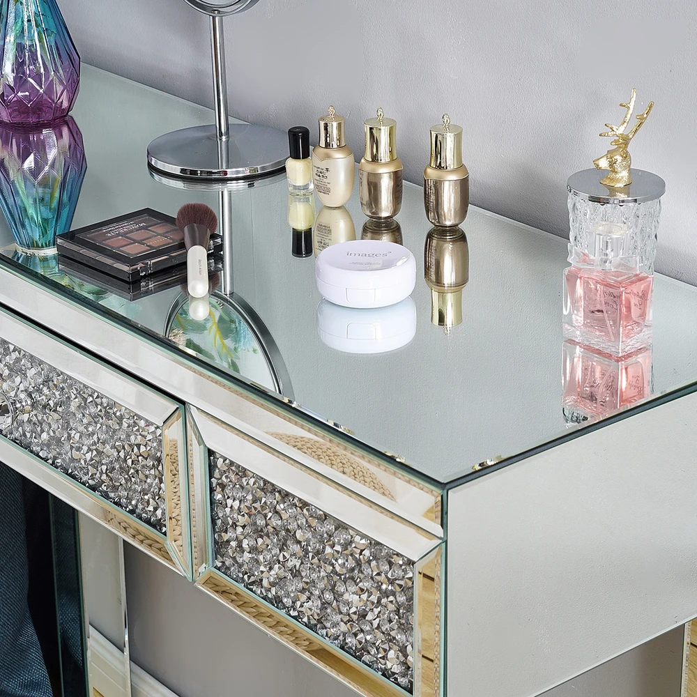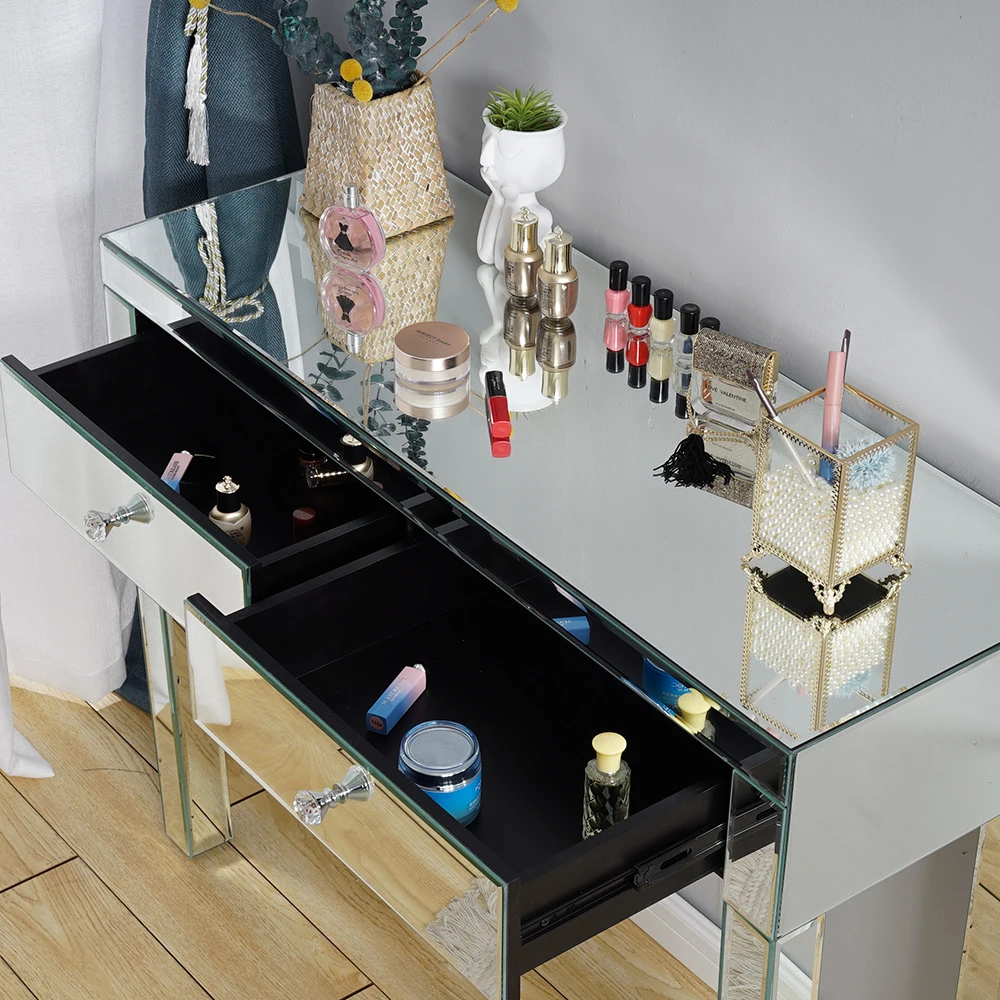 1. Туалетный столик: есть большой ящик в середине стола и два декоративных ящика с обеих сторон. Поверхность ящика завернута в стекло со многими маленькими кристаллами и обладает алмазным эффектом.