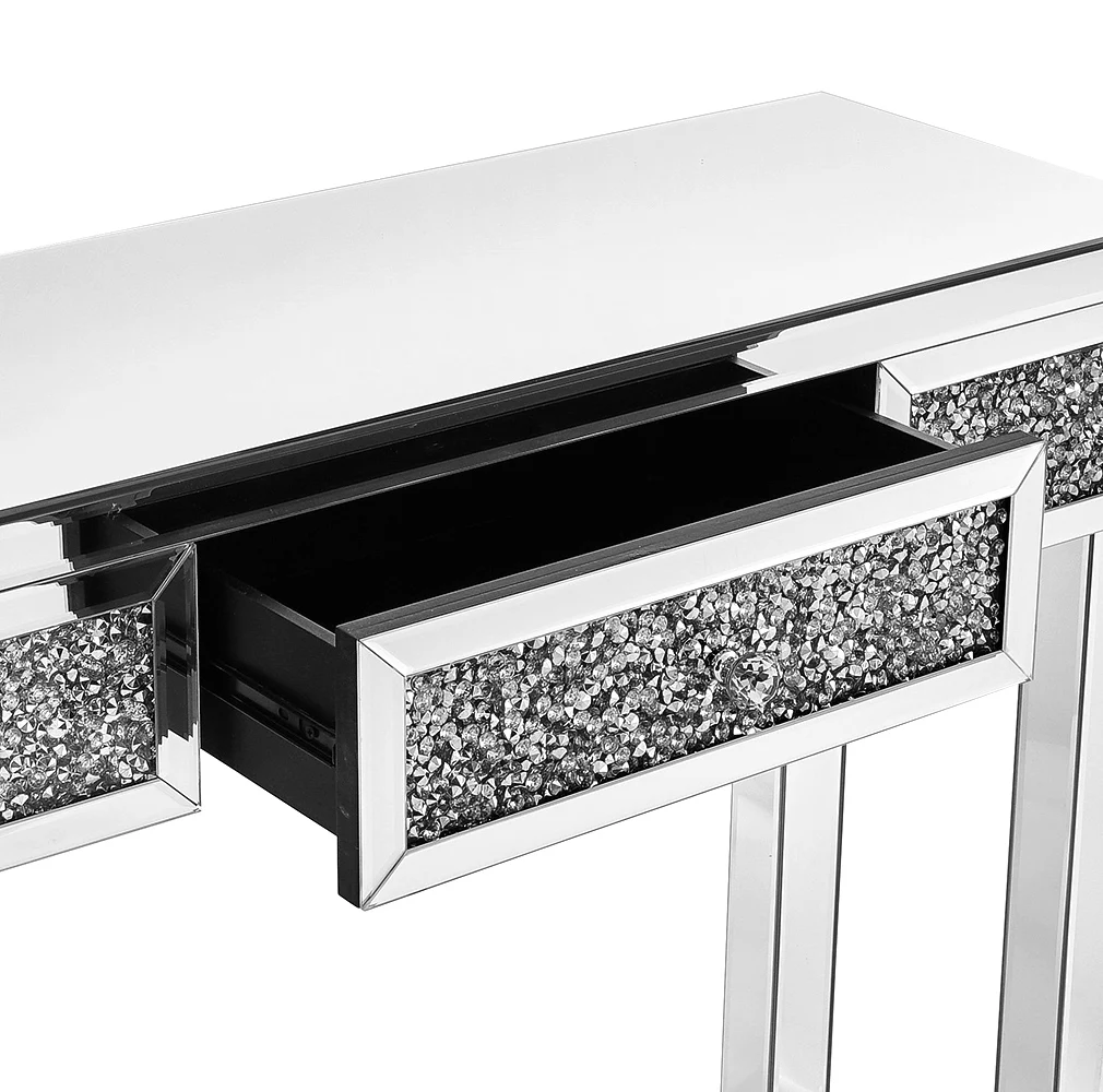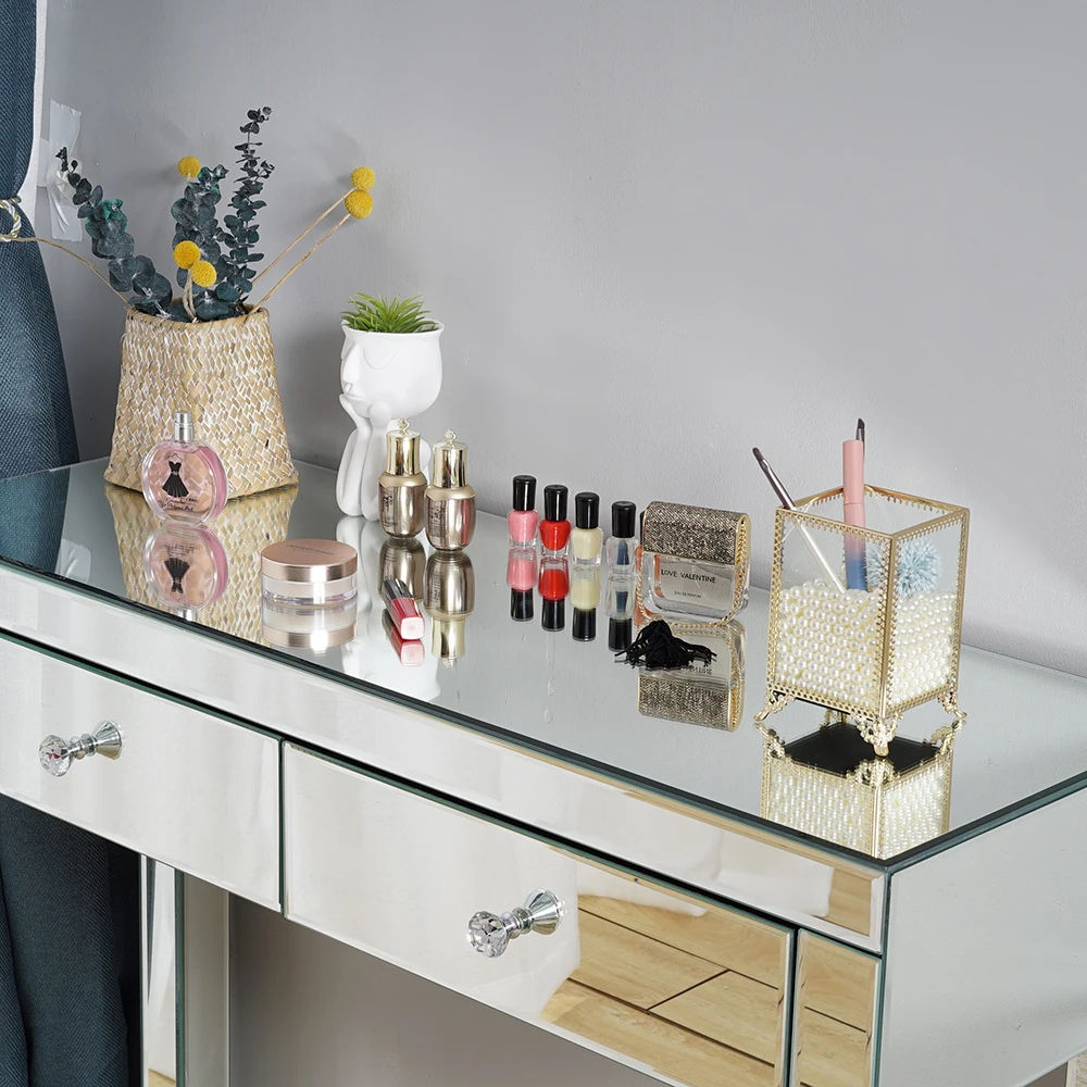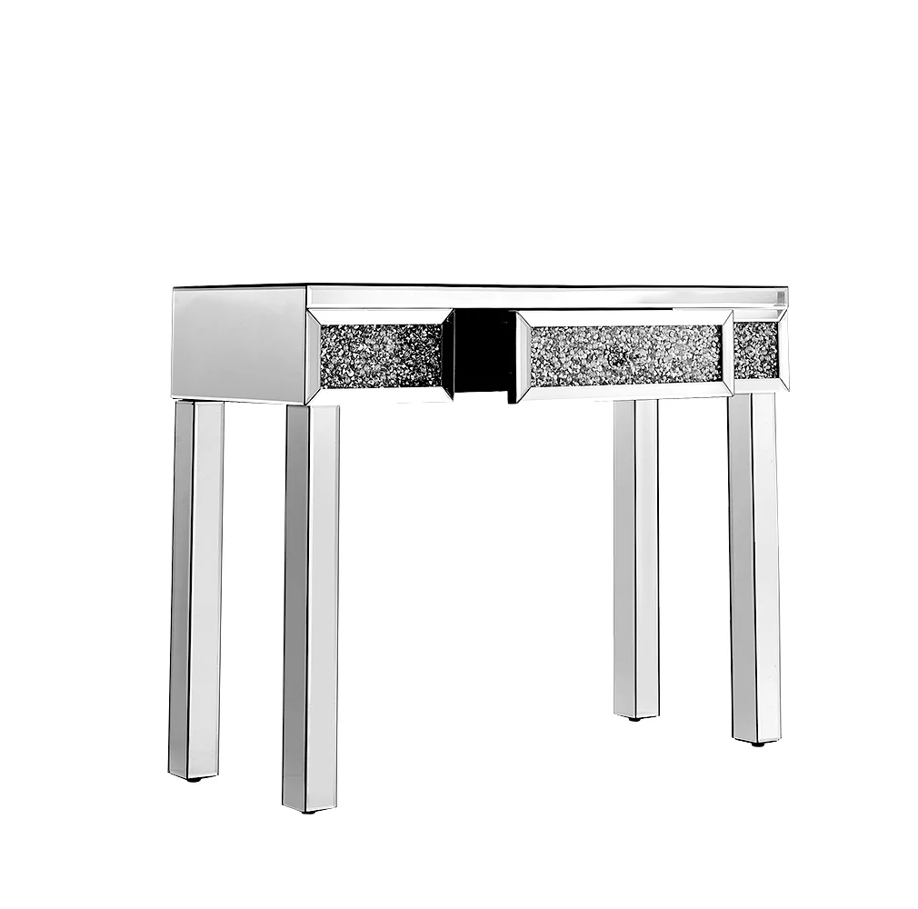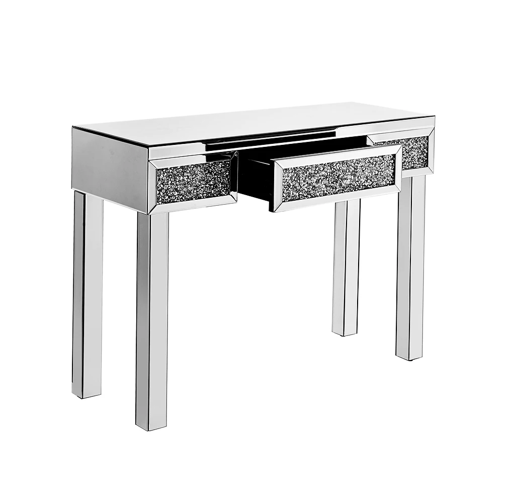 1. Туалетный столик: есть большой ящик в середине стола и два декоративных ящика с обеих сторон. Поверхность ящика завернута в стекло со многими маленькими кристаллами и обладает алмазным эффектом.