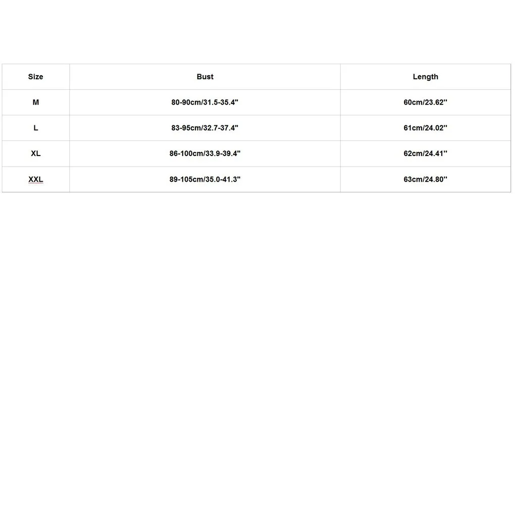 Size Bust Length M 80-90cm/31.5-35.4" 60cm/23.62'' L 83-95cm/32.7-37.4" 61cm/24.02'' XL 86-100cm/33.9-39.4" 62cm/24.41'' XXL 89-105cm/35.0-41.3" 63cm/24.80''