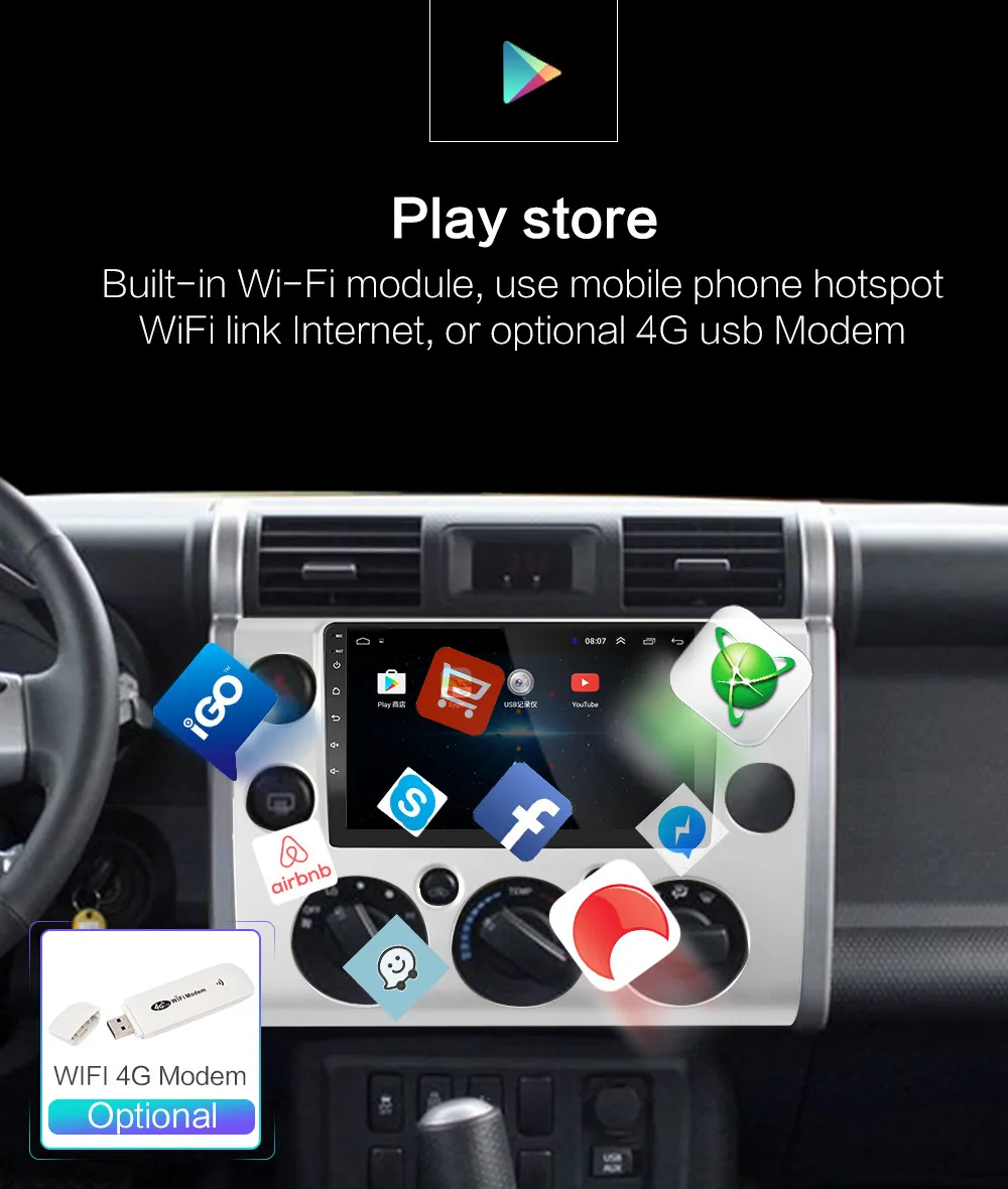 6. Поддержка: радиостанция, Bluetooth Вызов, Bluetooth музыка, управление рулевым колесом, встроенный WiFi, MP3, видео музыка (MPG, AVI), навигация, видеовыход, зеркальная связь, USB 4G LTE WIFI ключ и другие функции