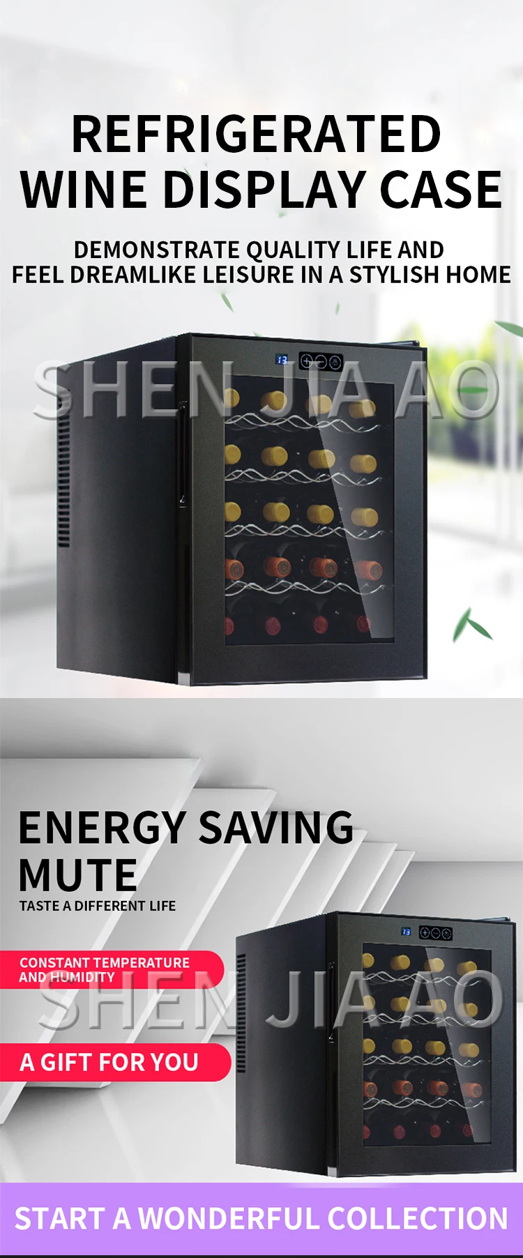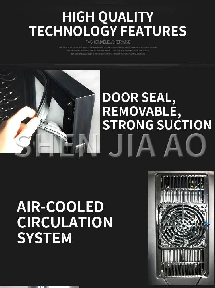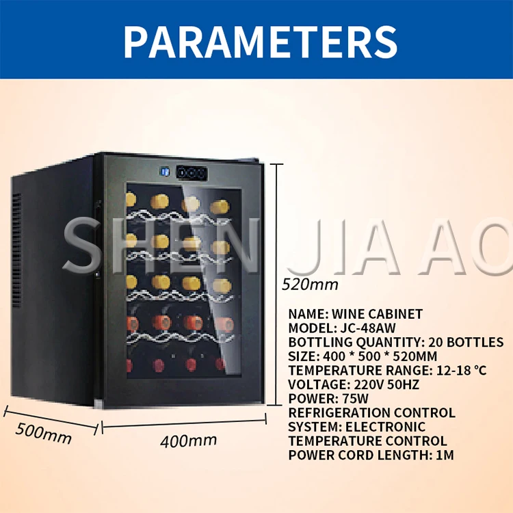 Название: винный шкаф Модель: JC-48AW Количество розлива: 20 бутылок Размер: 400*500*520 мм Диапазон температур: 12-18 ℃ Напряжение: 220 В 50 Гц Мощность: 75 Вт Система контроля охлаждения: электронный контроль температуры Длина шнура питания: 1 м