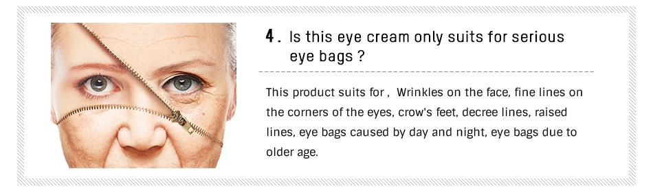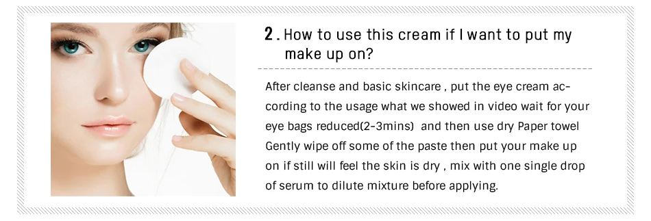 1 Почему я чувствую, что кожа сухая после использования? Может быть слишком большая дозировка или отсутствие увлажнения Если после высыхания появляется мелкий остаток, попробуйте положить мазок косметического крема для глаз на тыльную сторону руки и Смешайте с одной каплей сыворотки, Чтобы разбавить смесь перед нанесением 2 как использовать этот крем, если я хочу надеть макияж? После очистки и основного ухода за кожей Положите крем для глаз в соответствии с использованием того, что мы показали на видео, подождите, пока ваши мешки для глаз уменьшены (2-3 минуты), а затем мягко используйте сухое бумажное полотенце Вытрите часть пасты, затем Наденьте макияж, если все еще почувствуете, что кожа сухая, смешайте с одной каплей сыворотки, Чтобы разбавить смесь перед нанесением 3 как долго это длится? Обычно работает в течение 8-12 часов, результаты крема не являются постоянными. Пожалуйста, используйте непрерывно в течение длительного периода, чтобы получить постоянный результат. 4 этот крем для глаз подходит только для серьезных мешков для глаз? Этот продукт подходит для, морщин на лице, тонких линий на углах глаз, гусиных лапок, указательных линий, поднятых линий, мешков для глаз, вызванных днем и ночью, сумки для глаз из-за пожилого возраста 5 очищающих средств-базовый уход за кожей (тонер-сыворотка-лосьон)-омиледи настоящий крем для глаз-(продукты для макияжа)