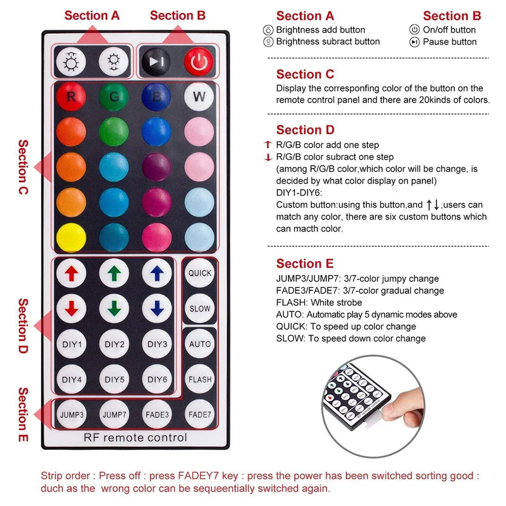 • ИК-управление: 44 кнопки, инфракрасный контроллер обеспечивает 22 основных цвета управления, 6 DIY управления цветами, 6 типов светильник, включая быстрое мигание, медленное мигание, автоматическое, мигание, 3 или 7 цветов светильник с поворотом, 3 или 7 цветов светильник с затемнением. Различные светильник режимов для вас, чтобы подогнать по размеру.