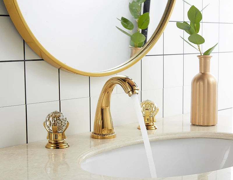 Tuqiu кран для раковины, золотой кран для раковины, 3 отверстия, широко распространенный смеситель для раковины, кран для горячей и холодной воды из латуни с кристаллами amd, новый кран для воды