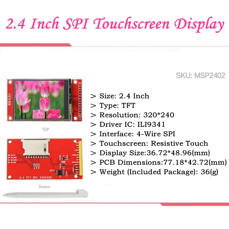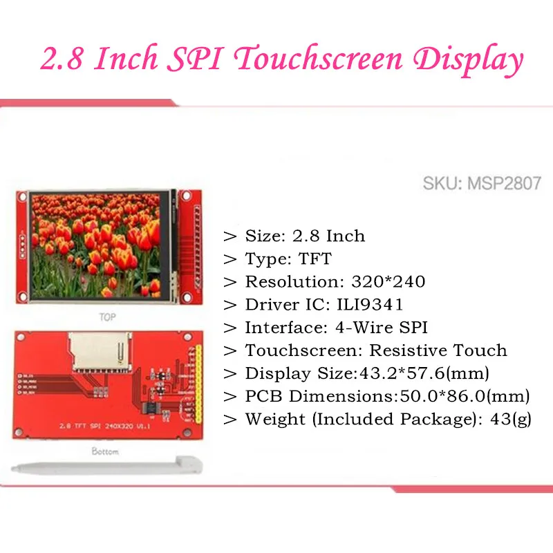Вики: 2,4 дюйма: http://www.lcdwiki.com/2.4inch_SPI_Module_ILI9341_SKU:MSP2402 2,8 дюйма: http://www.lcdwiki.com/2.8inch_SPI_Module_ILI9341_SKU:MSP2807 3,2 дюйма: http://www.lcdwiki.com/3.2inch_SPI_Module_ILI9341_SKU:MSP3218 3,5 дюйма: http://www.lcdwiki.com/3.5inch_SPI_Module_ILI9488_SKU:MSP3520 4,0 дюйма: http://www.lcdwiki.com/4.0inch_SPI_Module_ST7796