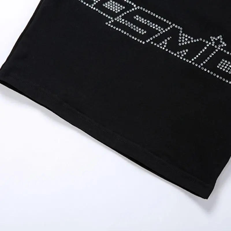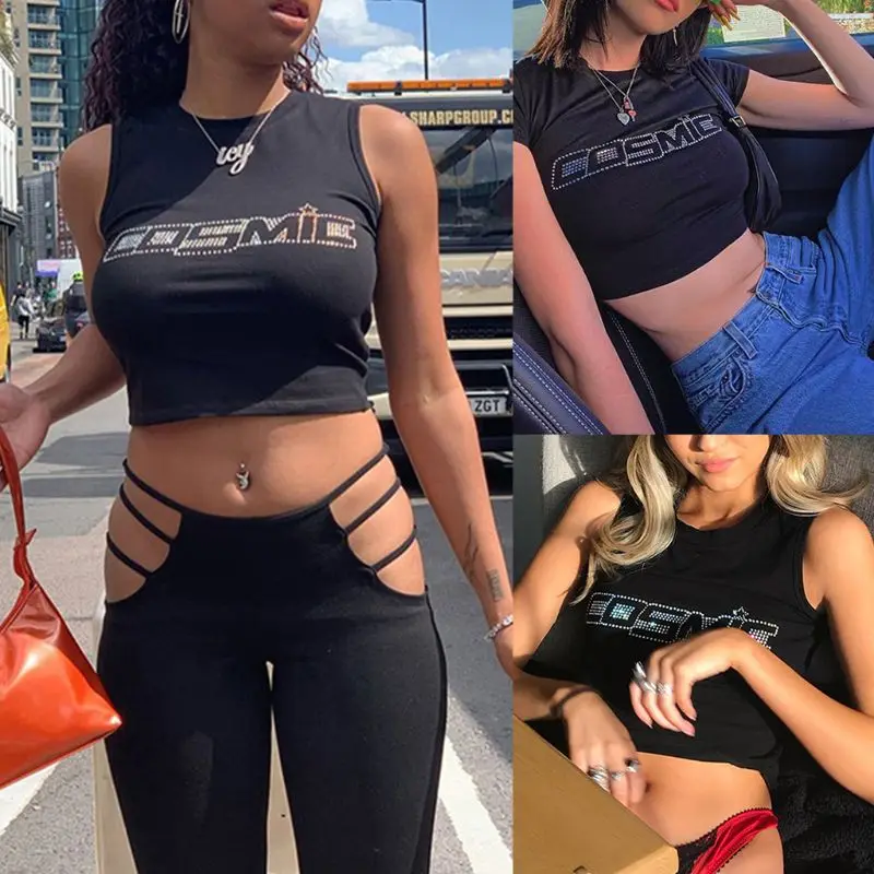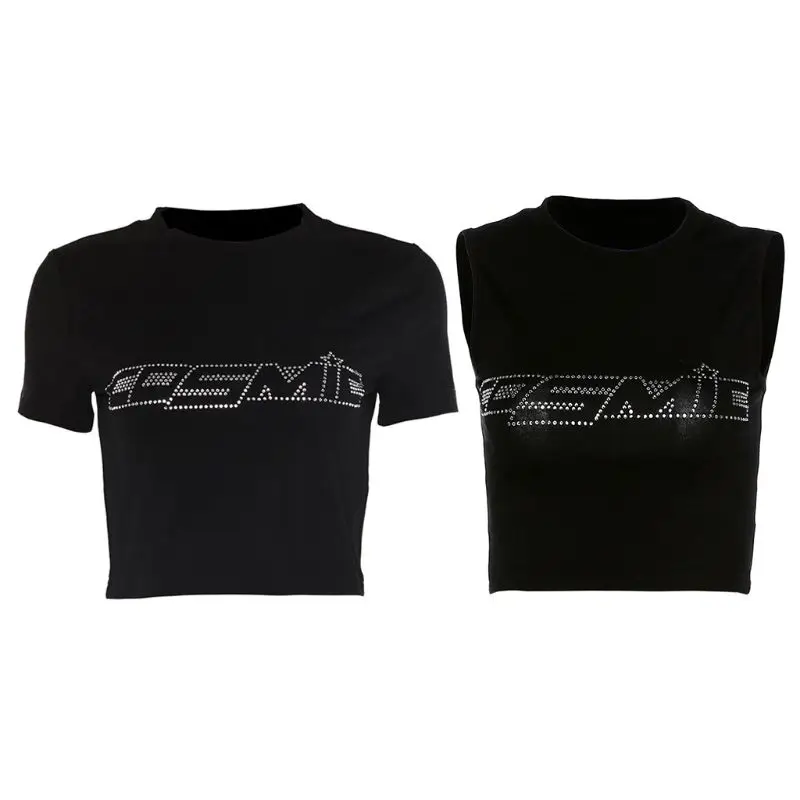 Женский летний укороченный топ с коротким рукавом/без рукавов, серебристые блестящие стразы, космические буквы, футболки, пупок, тонкий жилет, Клубные вечерние футболки, уличная одежда