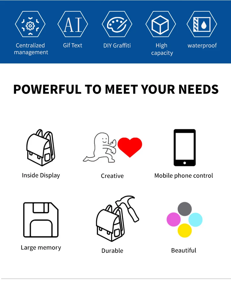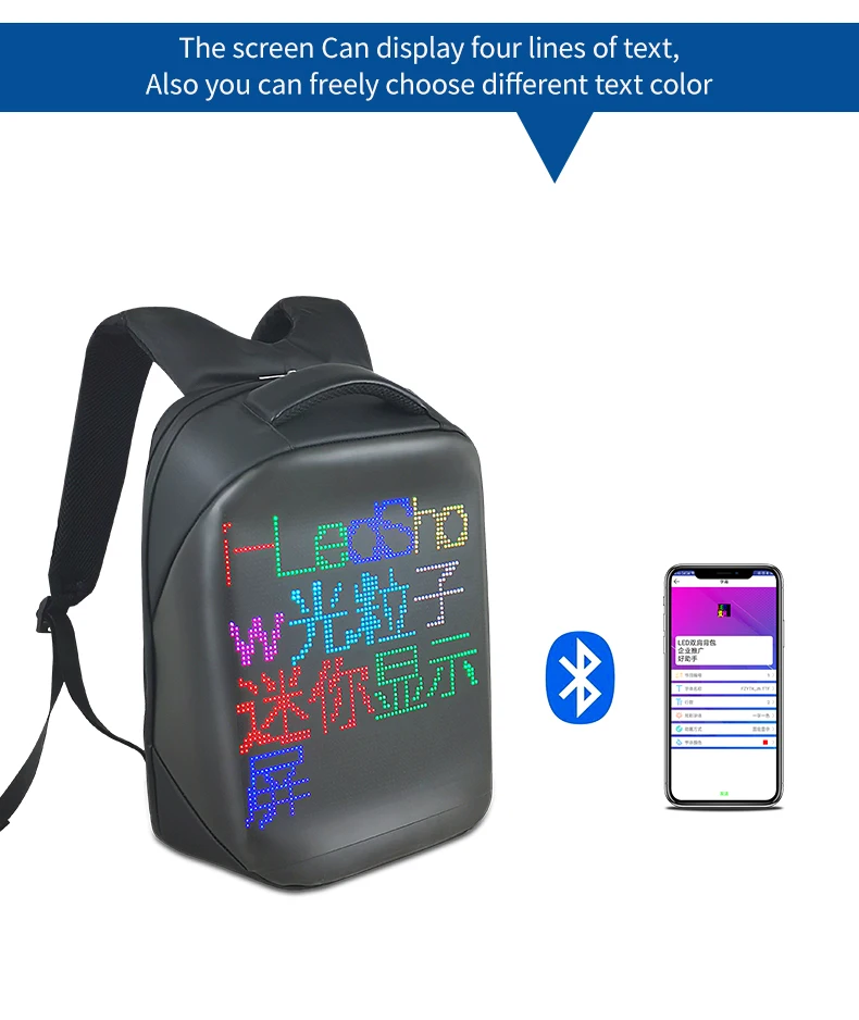 Название продукта: светодиодный рюкзак Номер модели: PB03 Пиксель: 64*64 Материал изделия: полиэстер, водонепроницаемый нейлон, светодиодный экран Продукт Цвет: черный Светодиодный цвет: RGB 7 цветов Язык: многоязычный Формат: анимация, текст, GIF изображение с 7 цветами Размер изделия: 460*320*140 мм Размер светодиодного экрана: 25,6*25,6 см Рабочее напряжение: 5 В Режим связи: беспроводной доступ в Интернет Источник питания: внешний аккумулятор Вес нетто: 1,2 кг Использование: реклама, школа, рекламный щит Описание: светодиодный рекламный экранный рюкзак с контролем за мобильный телефон. Прочная ткань: водонепроницаемая ткань (износостойкая). Внутренняя часть: полиэстер. Светодиодный экран питается от внешнего аккумулятора (не входит в комплект). Подключите внешний аккумулятор с внутренним usb-портом для зарядки (внутри рюкзака).