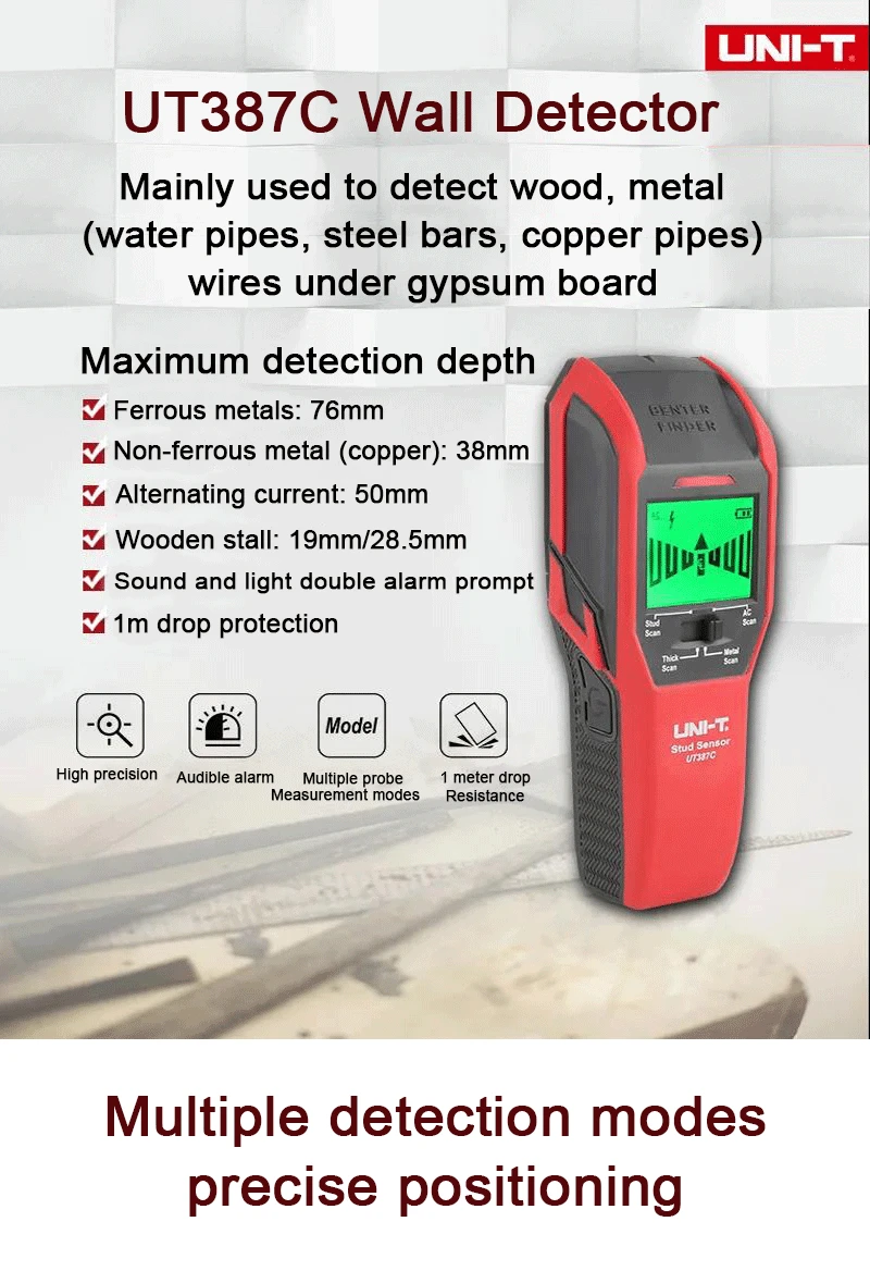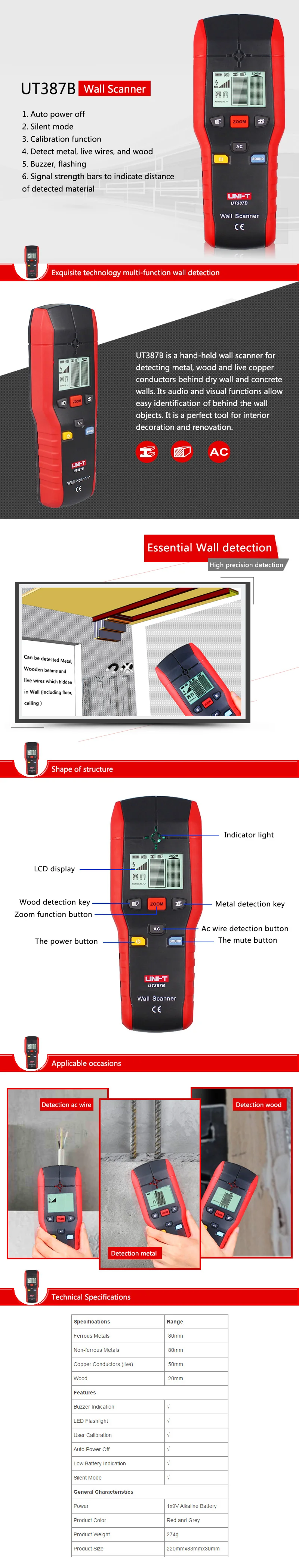UT387B-это ручной настенный сканер для обнаружения металлических, деревянных и живых медных проводников за сухой стеной и бетонными стенками, полом и потолком. Его аудио-и визуальные функции позволяют легко идентифицировать предметы за стеной. Это идеальный инструмент для украшения интерьера и ремонта.