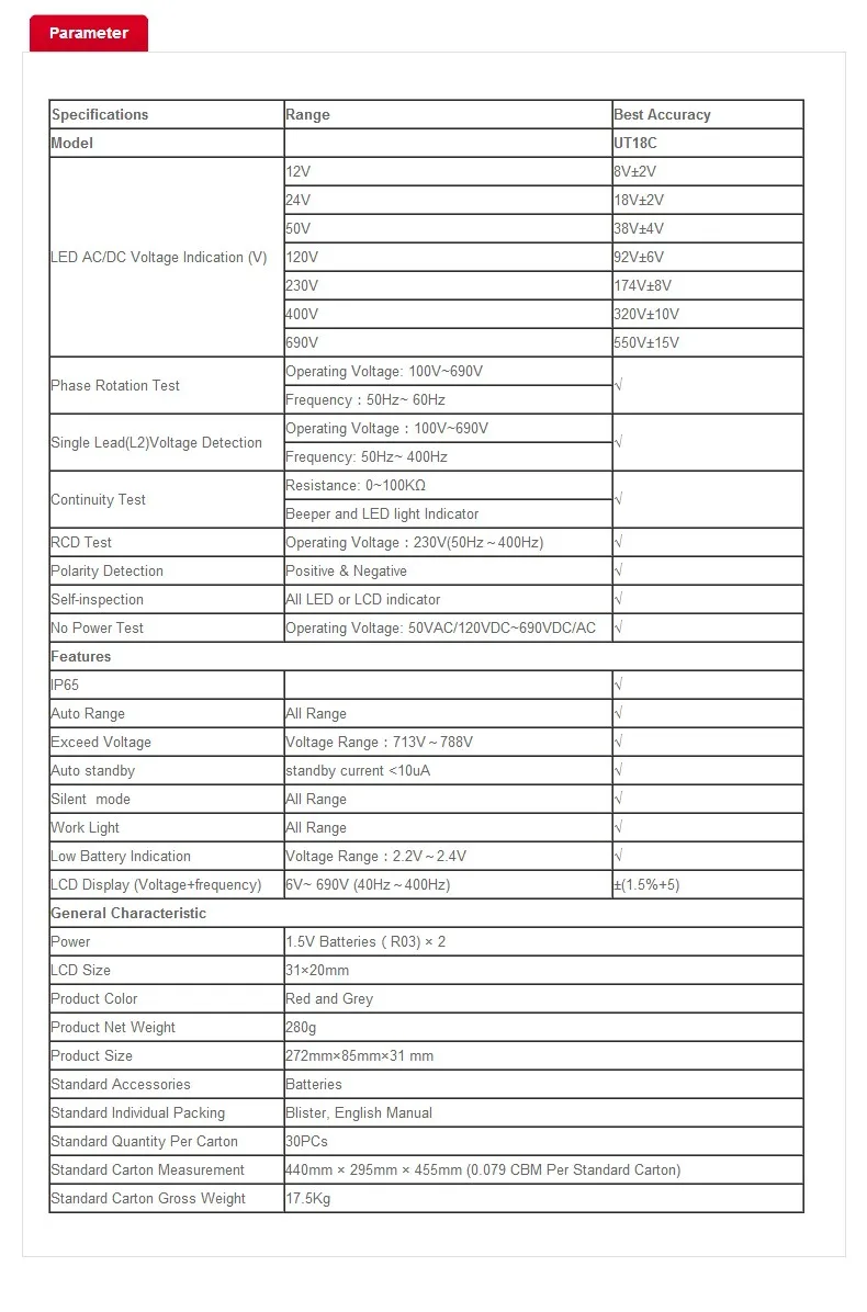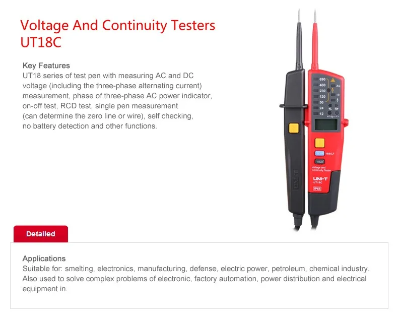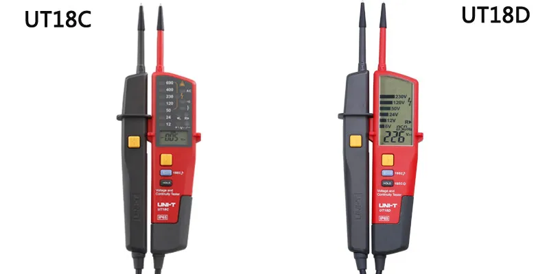UT18C/D может обеспечить измерение напряжения переменного и постоянного тока (включая Трехфазный переменный ток), фазу трехфазного индикатора питания переменного тока, испытание ВКЛ-ВЫКЛ, тест RCD, измерение одной ручкой (можно определить нулевую линию или провод), самопроверку и другие функции.