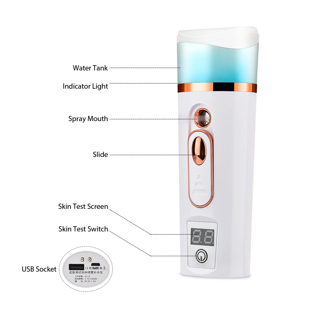 1. Высокочастотная вибрационная технология и нанораспыление делают влагу может проникать в глубину кожи для очистки. 2. Быстро произвести Лучший холодный туман для увлажнения кожи и не повредит макияж. 3. Контролируйте баланс масляной воды, Сделайте ваше лицо ярким и с хорошим цветом лица. 4. Емкость резервуара для воды 35 мл для последовательного пополнения воды. 5. Встроенный литиевый аккумулятор, может использоваться в качестве банка питания для зарядки телефона, когда он не работает. 6. Имеет функцию обнаружения кожи, которая может измерять влагу на вашей коже и будет отображаться на ЖК-экране. 7. Он поддерживает, чтобы быть добавлены несколько количества средств по уходу за кожей смешивания с минеральной водой, чтобы достичь эффекта отбеливания кожи. 8. Полное увлажнение: подходит для лица и тела, чтобы уменьшить морщины, уменьшить чувствительность кожи. 9. Мини размер и легкий, его удобно носить с собой.