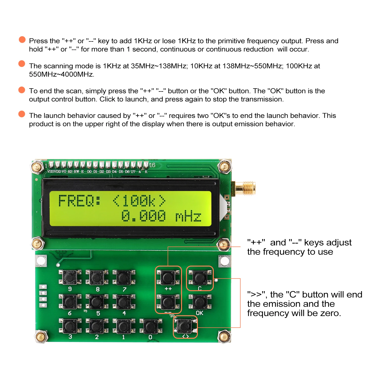 Нажмите клавишу «++» или «--», чтобы добавить 1 кГц или потерять 1 кГц к примитивному выходу частоты. Нажмите и удерживайте «++» или «--» более 1 секунды, непрерывное или непрерывное сокращение будет происходить.