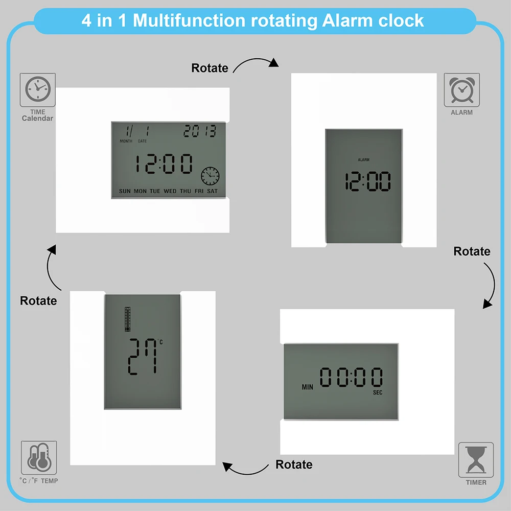 • Если вы ищете простой цифровой будильник с батарейным питанием, это идеальный выбор. • Вращающееся изделие для цикла через функцию ниже: Календарь ---- будильник ---- таймер ----- температура. • Отображение времени в 12 часов, год, месяц, дата, день недели. • Легко установить будильник, который будит вас каждое утро. • Таймер обратного отсчета: максимальный отсчет до 99 минут, 59 секунд. • Температура в помещении (градусы по Фаренгейту и по Цельсию) • ЖК-дисплей прозрачный, без подсветки. • 2 батарейки XAAA (не входят в комплект)