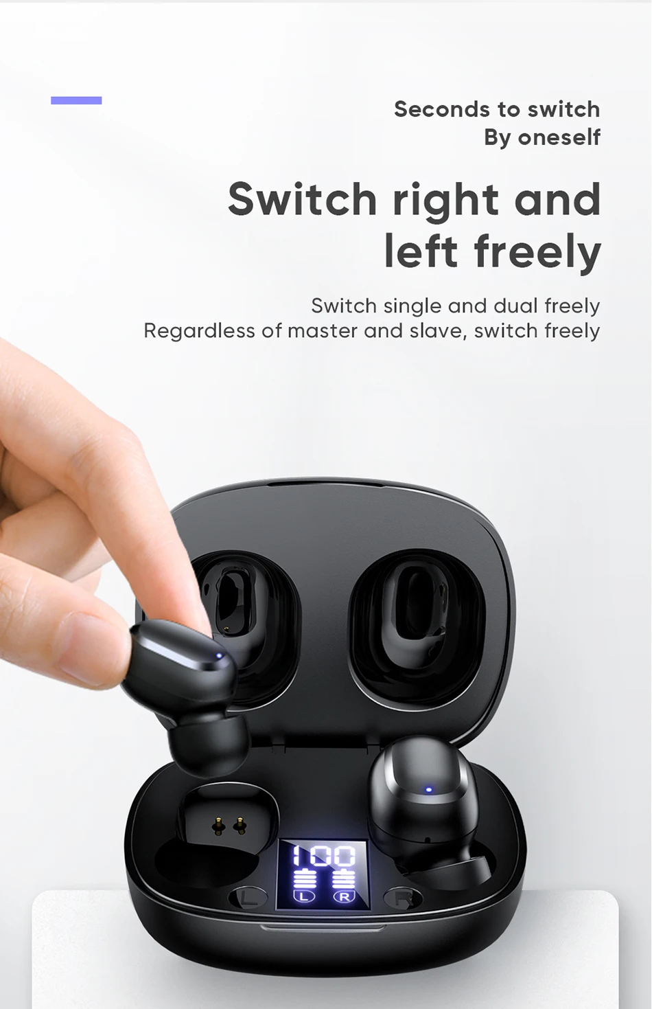 1. Интеллектуальный светодиодный дисплей и инструкции по зарядке, будьте в курсе энергопотребления в любое время 2. Маленький и компактный, очень лаконичный, легко упаковывается, путешествует без беспокойства 3. Истинный беспроводной Bluetooth 5,0, низкое энергопотребление, стабильная передача 4. Вынимайте и подключайте, Автоматическое Сопряжение, нет громоздких 5.3D сенсорный отпечаток пальца, высокочувствительные сенсорные компоненты, удобное управление одной кнопкой 6. Импортный дизайн микрофона, hd-звонок в реальном времени 7. Одиночное и двойное использование, нет различия между основным и вспомогательным, переключение между секундами по желанию 8. Сверхлегкий светильник, удобно носить в течение длительного времени без нагрузки