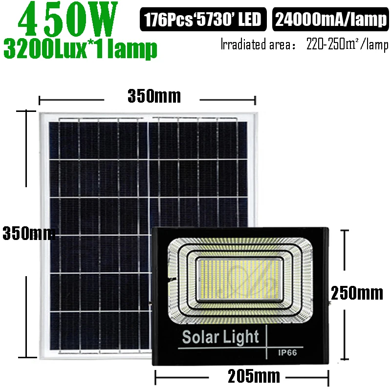 Светодиодный: '5730 'SIM 208 шт. Люмен: 4500Lux Облученная площадь: 250-280 ㎡ (квадратный метр) Размер лампы: 300*245 мм. Лампа Вес: 2,2 кг. Размер панели солнечных батарей: 450*350 мм. Вес солнечной панели: около 2 кг Солнечная панель: 20 В/6 Вт. Батарея: 3,7 V 36000m Ah; Литиевая батарея Батарея. Время зарядки: 6-10 часов. Время работы: 8-15 часов.