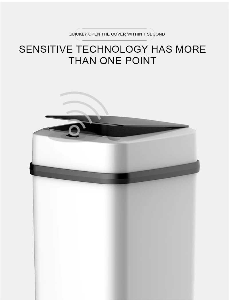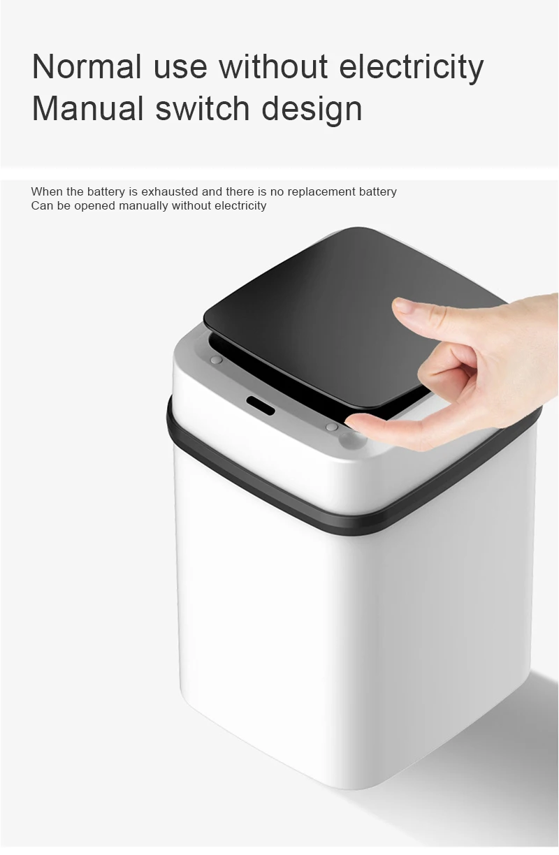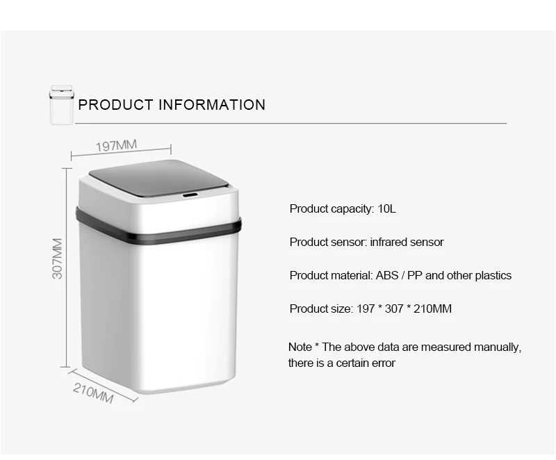 Тип товара: Полностью Автоматическая Индукционная умная мусорная корзина с крышкой Размеры: 31x21x20cm Материал: ABS + полипропилен PP + электронные компоненты Ёмкость: 10L Место адаптации: спальня, гостиная, кухня, ванная комната Особенности: 1. Обновленный чип, автоматическая индукция, расстояние обнаружения 30 см 2. Бесшумный, пуговицы, 0,3 s чувствительный отклик, 5S вдали от срабатывающая дистанция, он автоматически отключится. 3. Автоматическая идентификация, если вы не выходите, вы не закрываете крышку. 4. Увеличение емкости и длительный срок службы батареи Примечание: для модели аккумулятора требуется только два аккумулятора № 5, который используется для 6-8 месяцев (без аккумулятора) Упаковочный лист: 1 мусорная корзина + usb-кабель для зарядки или 1 мусорная корзина (без аккумулятора)