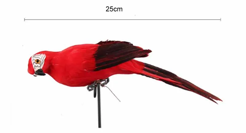 Размеры: 25x5CM Искусственное украшение для сада Птица Ноги попугаев завернуты в мягкую железную проволоку, которую можно сгибать случайным образом и хватать на дерево или зацепить где-то. Очень удобно в использовании. Основной корпус-пенопласт, но перья снаружи настоящие, и каждое место отражается на намерениях дизайнера. Подходит для использования в помещении и на открытом воздухе.