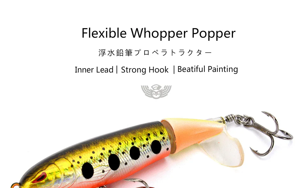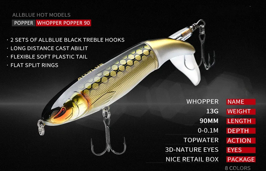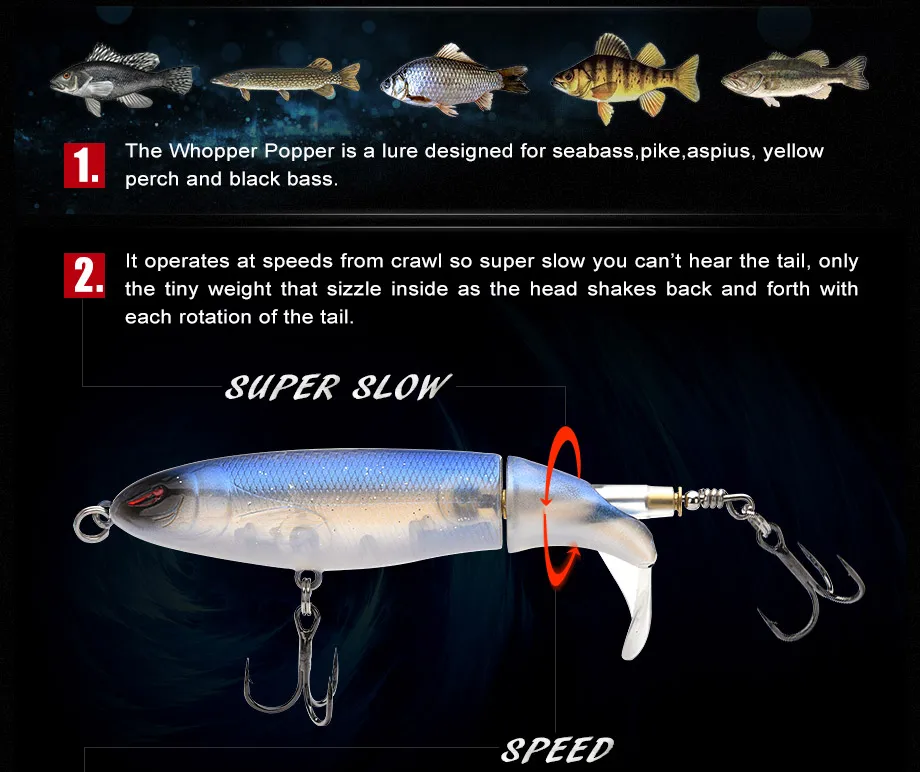 1.Whopper Popper-это приманка, предназначенная для морских птиц, щуки, aspius, желтого окуня и черных басов.