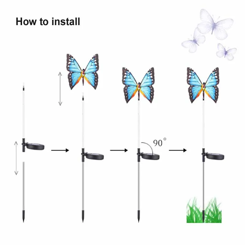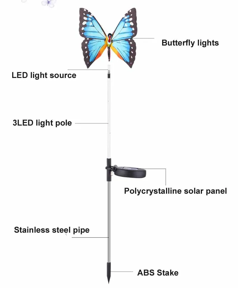 Название продукта: Солнечная бабочка Панель солнечной батареи: аморфный кремниевый панели солнечных батарей 2V/0,4 W (40x40 мм) Батарея: Nipc перезаряжаемый аккумулятор Батарея 1 шт. AA 1,2 v 600MAH Светильник источник света: 6 зеленого и синего цветов Изменение цвета лампы Время работы: 6-8 ч Время зарядки: 8-10 ч Функция: управление на светильник + переключатель вкл./выкл. Управления, нужно только включить переключатель, когда он используется в первый раз, он будет автоматически заряжаться в течение дня и работать автоматически в ночное время (светильник включен) Класс водонепроницаемости: IP65 Материал: нержавеющая сталь и АБС-пластик + Поликарбонат Посылка: 3 шт., бабочка