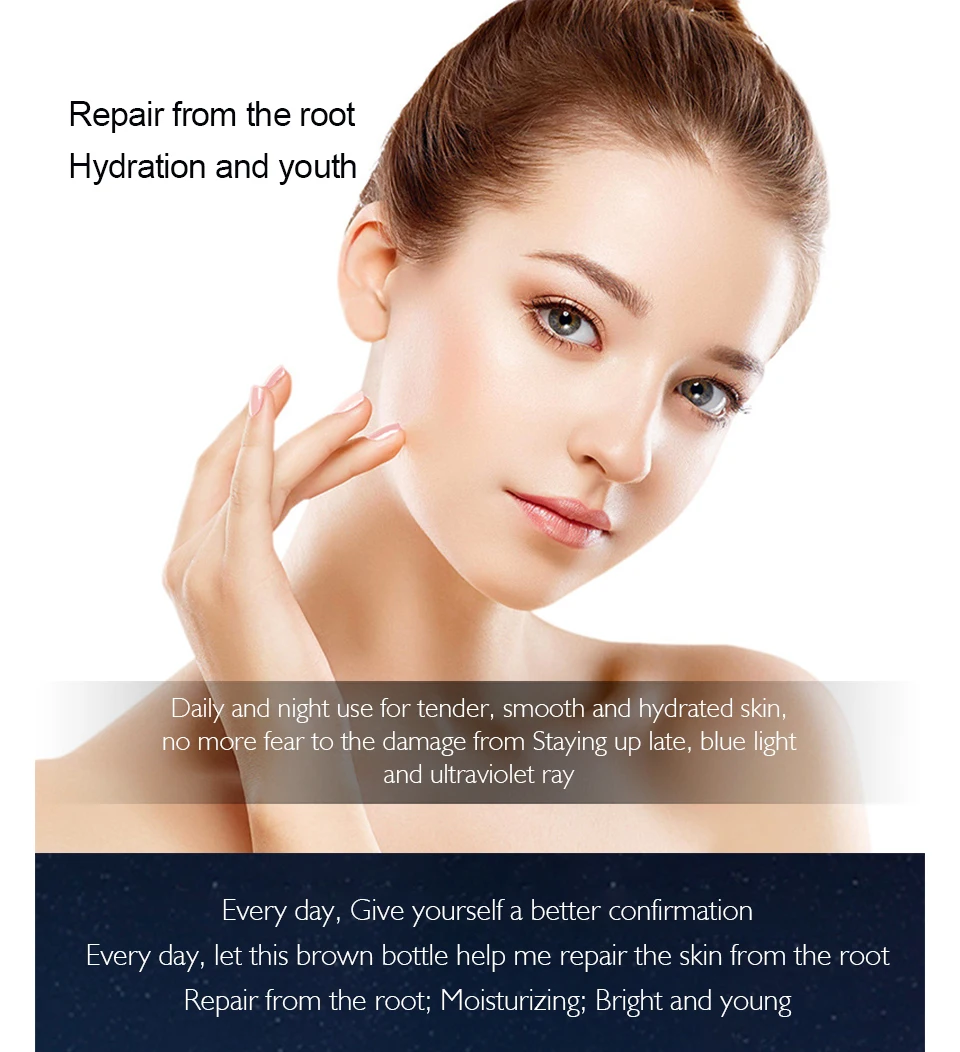Ремонт от корня; Увлажнение и молодость Ежедневное и ночное использование для нежной, гладкой и увлажненной кожи, больше не бойтесь повреждения от позднего пребывания, синий светильник и ультрафиолетовые лучи Каждый день, дайте себе лучшее подтверждение Каждый день, позвольте этой коричневой бутылке помочь мне восстановить кожу от корня Восстановление от корня; Увлажнение; Яркий и молодой