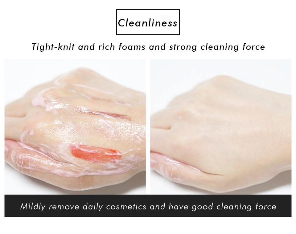 Баланс воды и масла Безупречный тендер Обладают увлажняющим и очищающим эффектом, очищают дополнительную смазку и грязь, снимают черные точки, сбалансируют воду и масло и делают кожу чистой и прозрачной. Чистота Плотная вязка и богатые пены и сильная Чистящая сила Мягко удаляет ежедневную косметику и имеет хорошую чистящую силу