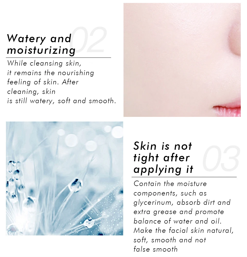 Выдающаяся Очищающая питательная и увлажняющая сила Тонкие пены Гладкая молочная текстура Можно стирать из плотной пены и легко удалять грязь и старую кожу Водный и увлажняющий Во время очищения кожи, она остается питательным ощущением кожи. После очистки, кожи По-прежнему водянистая, мягкая и гладкая. Кожа не тугая после нанесения. Содержит компоненты влаги, такие как глицерин, впитывает грязь и дополнительную смазку и способствует сбалансированию воды и масла. Делает кожу лица естественной, мягкой, гладкой и не накладной гладкой.
