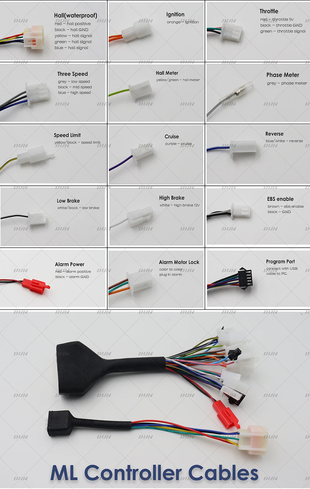 Заглушка холла, заглушка дроссельной заслонки, зажигание, сигнал скорости холла, сигнал скорости фазы, высокий тормоз (12 В), низкий тормоз (0 В), ограничение скорости, трехскоростной переключатель, обратный, защита от кражи, круиз, USB кабель, EBS.