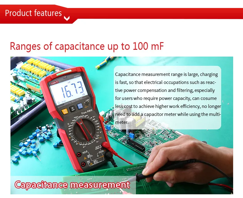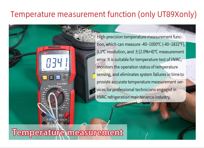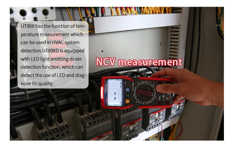 UT89X/UT89XD-это надежный Ручной цифровой мультиметр 35/6 бит с истинным измерением синусоидальной волны RMS. Он может измерить Макс. 1000 В постоянного/переменного напряжения, Макс. 20A DC/AC Ток, сопротивление, емкость, частота, диод, hFE, непрерывность и NCV, быстрое различие между нейтральными и живыми проводами точно. UT89X может измерять температуру и обнаруживать нейтральные и живые провода с тестовым руководством. UT89XD может выполнить светодиодный тест. Оснащенный звуковым и видимым сигналом, фонариком и функциями автоматической подсветки, эта серия может использоваться в темной среде. Он привлекает пользователей своим двухцветный прочный Чехол, современный внешний вид и множество функций.