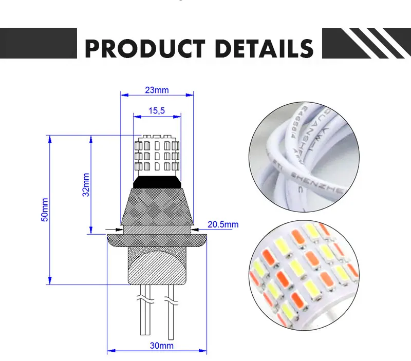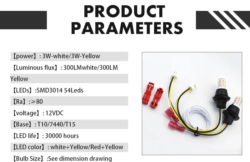 【Название продукта: T10 дневной ходовой светильник + указатель поворота 【Мощность 】: 3w-белый/3w-желтый 【Световой поток: 300 лмбелый/300 лм желтый 【LEDs】:SMD3014 54 светодиода 【Ra】:≥ 80 【Voltage】: 12VDC 【Основание: T10/7440/T15 【Светодиодный срок службы: 30000 часов 【Цвет светодиодов: белый + желтый/красный + желтый 【Размер лампы 】: см. Размерный рисунок.