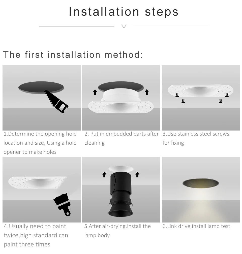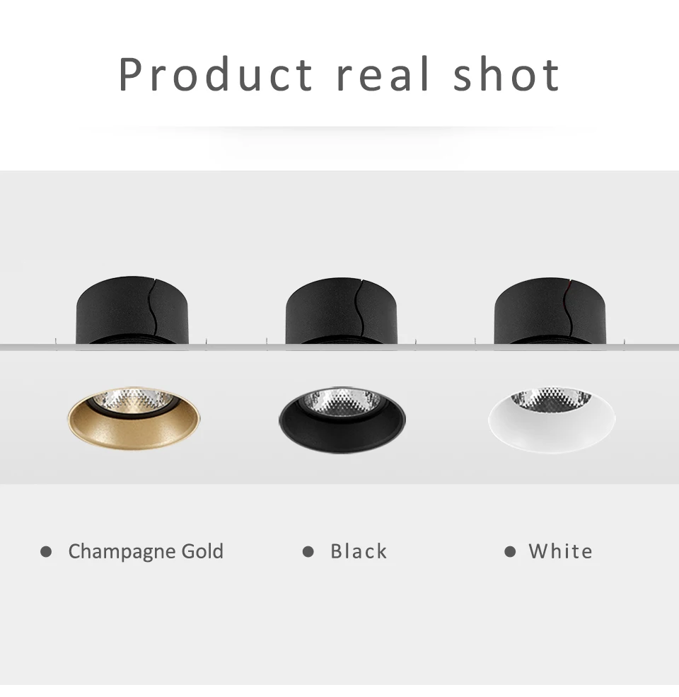 Отверстия для потолка: φ8-8.5cm Высота: 7 Вт-7,5 см, 12 Вт-9,5 см Угол луча: 15 ° / 24 ° / 40 ° (по умолчанию отправляется угол луча 24 °, пожалуйста, свяжитесь с нами, если вам нужны другие углы)