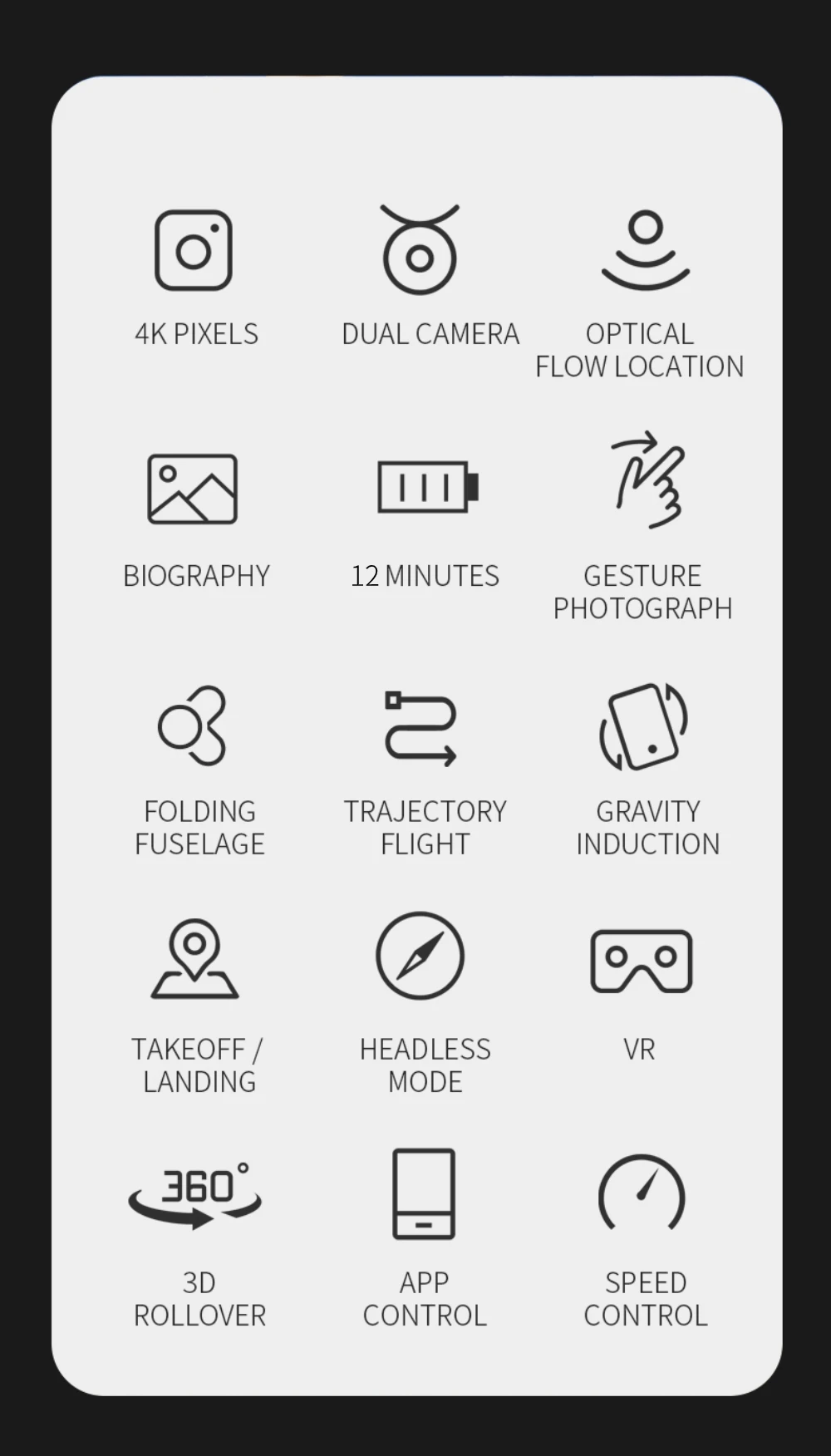 Описание:Позиция №:S161Цвет: серыйПрименимый возраст:14 лет или старшеВнешний вид Материал: АБС-пластикКанал: 4 КаналыГироскоп:Квадрокоптер с 6 осямиКонфигурация частота: 2,4 ГГцПульт дистанционного управления Управление расстояние:150 метров(Без помех, без окклюзии)Время зарядки: 3Часов или около тогоВремя полета:12 минут или около тогоРисунок расстояние:80 м(Без помех, без окклюзии)Метод передачи: с видом от первого лицаРежим записи фотографий: пульт дистанционного управления + управление приложениемАккумулятор дистанционного управления: 4 * AA (приобретается самостоятельно)КвадрокоптерПерезаряжаемая батарея: 3,7 V 1600mAh литиевая батарея (входит в комплект)КвадрокоптерSРазмер: 33*33*5,5 см(Нескладываемая),10*16*5,5 см(Складная)Особенности:-С складной ручкой, маленький размер, легко носить с собой.-4K HD Камера. Можно регулировать угол 90 ° вручную.- Оптическим позиционированием. Фиксированная высота точки, и она может снимать более легко и стабильно внутри.-Режим удержания высоты. Установив давление воздуха снаружи, Квадрокоптер может стабильно парить в воздухе, что облегчает съемку.- Жест фото/видео. Вы сломаете старый способ фотографирования и найдете новую вещь, сделав жесты, чтобы записать вашу красоту. (в пределах 1-3 м)- 12Минут максимальное время полета. Повышенной емкости 3,7 V 1600 мА/ч, интеллигентая (ый) батарея производит до 12 минут времени полета.- Режим следуй за мной. Дрон будет автоматически следовать за вами и захватывает вас везде, где вы двигаетесь. Держать вас в кадре в любое время, легче получить сложные снимки, обеспечивает беспилотный полет и самообслуживания- Путевой режим полета. Откройте приложение drone, используйте план полета у вас под рукой, просто нарисуйте маршрут на экране, вертолет будет автоматически летать по указанному пути.-2,4 ГГц Технология, принятая для защиты от помех.-6 оси гироскопа, который может иметь более стабильный полет и быть простым в управлении.-Функция возврата с одним ключом позволяет легко найти дорогу домой.-С безголовым режимом, не нужно регулировать положение самолета перед полетом.-Фюзеляж квадрокоптера изготовлен из высокопрочного и стойкого инженерного пластика, легкого и прочного сопротивления.Функция:Приложение управления полетом, 1Расстояние полета 50 метров,Режим следуй за мной,Удержания высотыРежим,Режим полёта Waypoint, оптическое позиционирование потока, фото/видео жестов, Безголовый режим, фиксированное hover,Один ключ Взлет/посадка, один ключ возвратУпаковочный лист:1 х летательный аппарат1 х пульт дистанционного Управление1 x авиационная батарея (встроенный корпус)2 х Запасные пропеллеры4 х Защитная рамка1 х Usb кабель для зарядки1 х ОтверткаРуководство пользователя-1 шт.;
