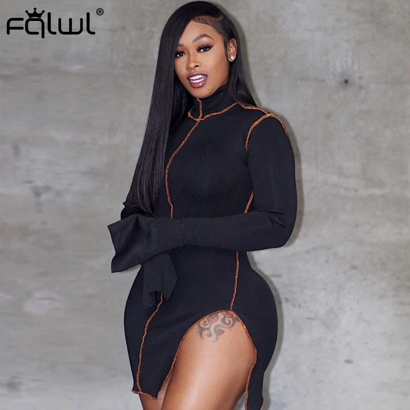 Женское облегающее платье с длинным рукавом FQLWL, черное облегающее мини-платье с высоким воротом, Летние Короткие вечерние платья