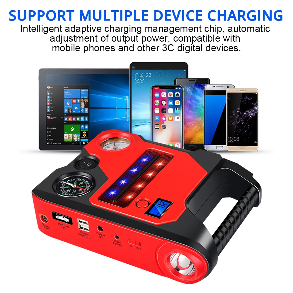Он может начать автомобиль и для накачки шин, поддерживает дизельные модели транспортных средств с указанным ниже техническим требованиям 12V/3,0 и поддержка транспортных средств с бензиновым двигателем с указанным ниже техническим требованиям 12V/6,0.