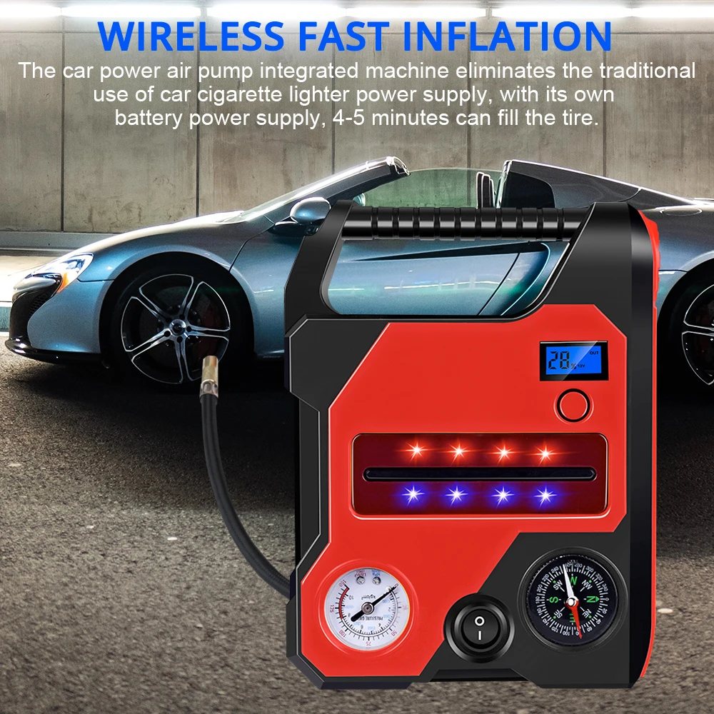 Интегрированная машина для автомобильного воздушного насоса устраняет традиционное использование автомобильного прикуривателя, с собственным источником питания аккумулятора, 4-5 минут может заполнить шину.