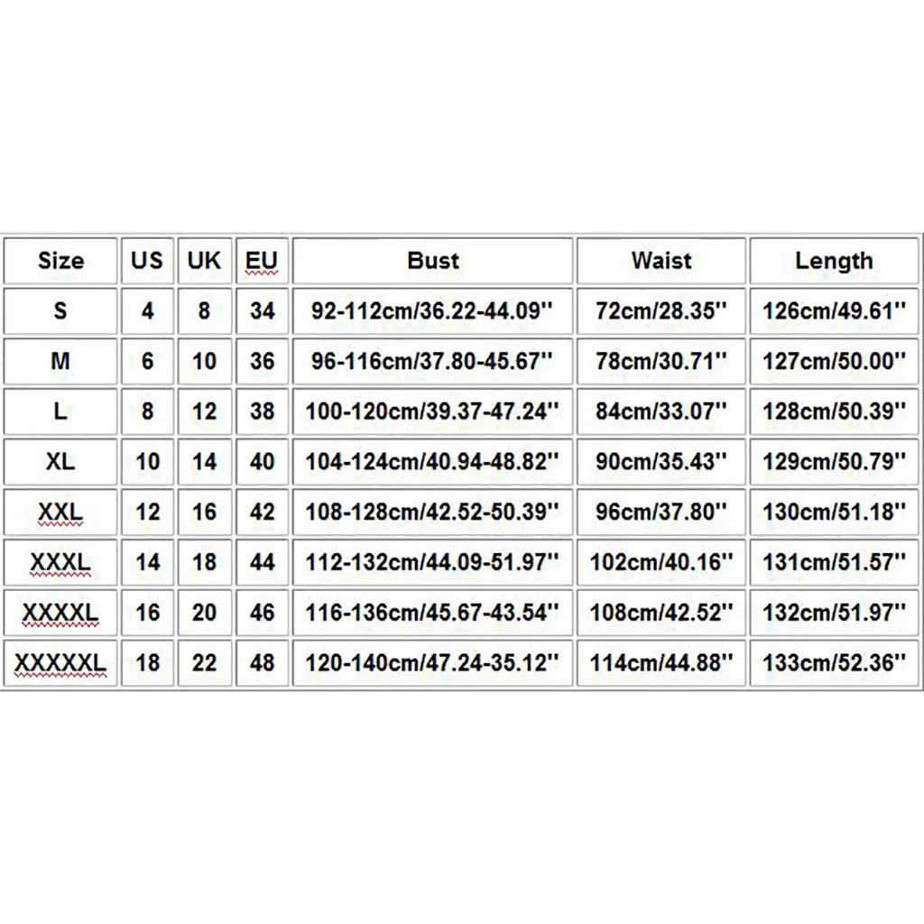 Что вы получаете: 1 женское платьеРазмер США Великобритания ЕС Бюст Талия Длина S 4. 8 34 92-112 см/36,22-44,09 дюйма 72 см/28,35'' 126 см/49,61'' М 6 10 36 96-116 см/37,80-45,67'' 78 см/30,71'' 127 см/50,00'' L 8 12 38 100-120 см/39,37-47,24'' 84 см/33,07'' 128 см/50,39'' XL 10 14 40 104-124 см/40,94-48,82'' 90 см/35,43'' 129 см/50,79'' XXL 12 16 42 108-128 см/42,52-50,39'' 96 см/37,80'' 130 см/51,18'' XХХL 14 18 44 112-132 см/44,09-51,97'' 102 см/40,16'' 131 см/51,57'' XXXXL 16 20 46 116-136 см/45,67-43,54'' 108 см/42,52'' 132 см/51,97'' XXXXXL 18 22 48 120-140 см/47,24-35,12'' 114 см/44,88'' 133 см/52,36''